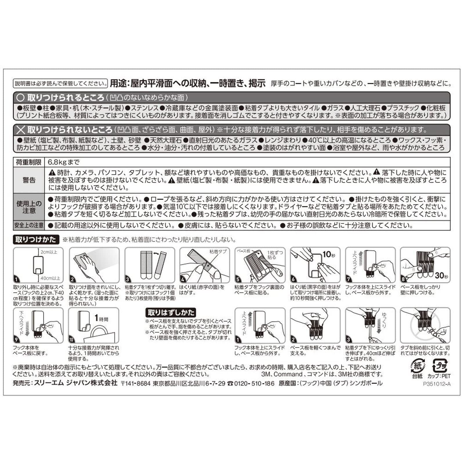コマンドフック史上最大の耐荷重。シンプルでスタイリッシュなデザイン。幅広で奥行きのあるフック形状。取り付け面を傷めることなく設置でき、不要になったり移動する時はきれいに取り外せる。タブをゆっくり引き伸ばせば、のりを残さずきれいに、はがせる。はがしたフックは、粘着テープ(タブ)を取り替えて再利用できる。強力なフックなので、バッグやランドセル、リュック、カバン、厚いコート、荷物の一時置きや備品などの収納に便利。(耐荷重6.8kgまで)壁紙には使用できませんのでご注意ください。また、壁の素材によっては十分な耐荷重が得られない可能性があります。また、化粧シート構造の壁や表面の状態によっては、傷める場合がありますのでご注意ください。