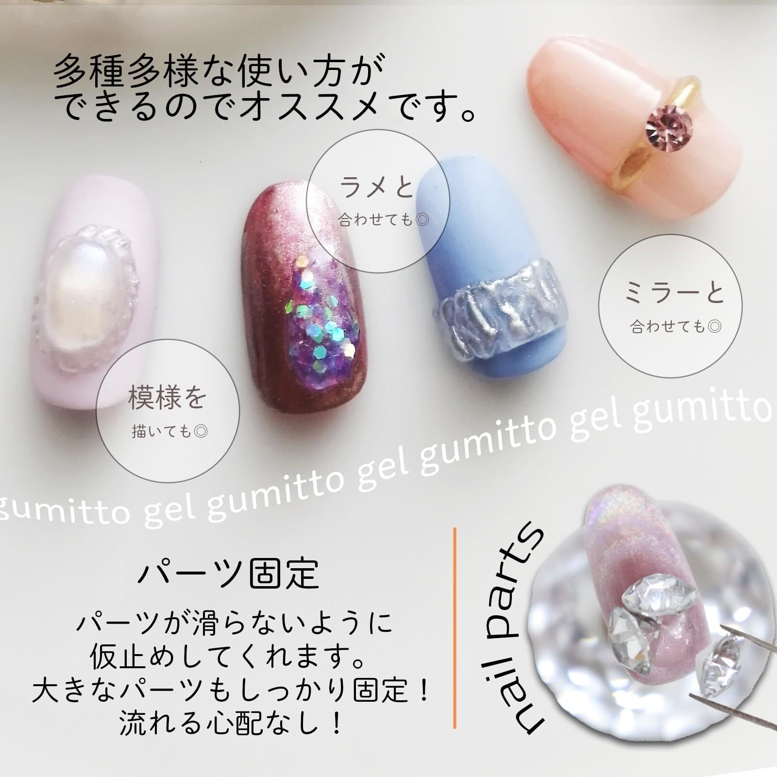 【パーツ固定】パーツが滑らないように臨時に固定してくれます。ベストポジションに固定し隙間等をしっかり埋めることにより存在感のあるネイルパーツをしっかり固定するのに役立ちます。