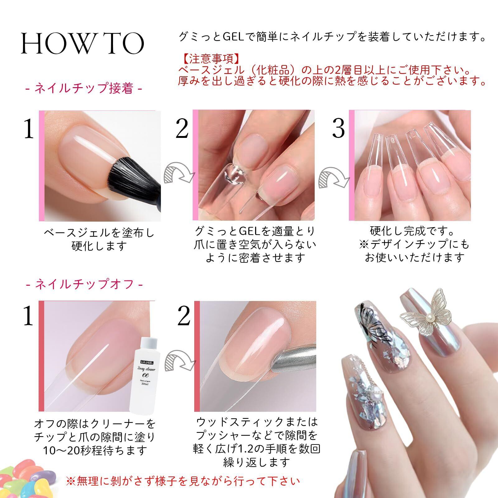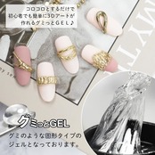 【ネイルチップ接着剤】ベースジェルの上に適量のグミッとジェルをのせ硬化するだけで強力にネイルチップを接着できます。熱いお湯でチップを外す事が可能なので、チップ側についたジェルを除去すればチップの使いまわしもできるので、デザインチェンジも容易にできます。