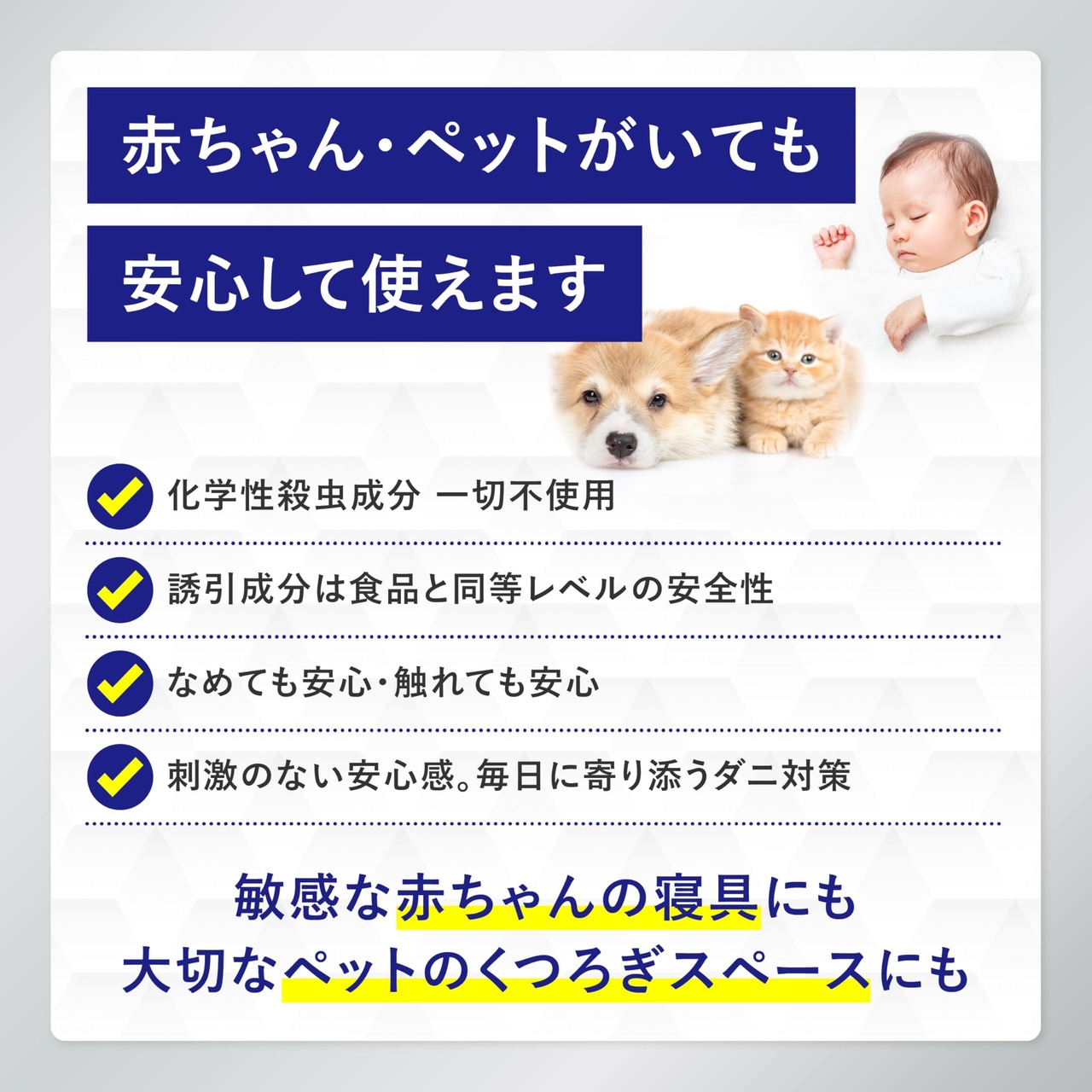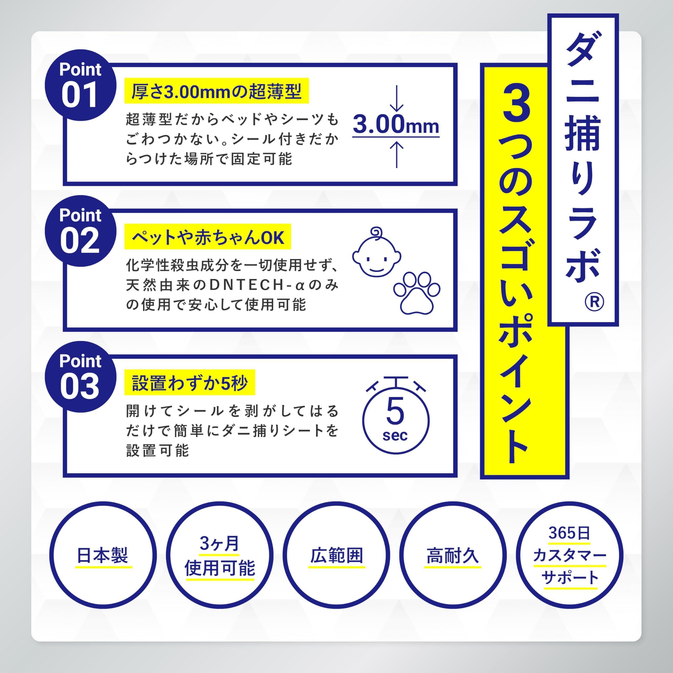 業歴20年の衛生管理製品開発開発。独自開発のDNTECH-αがダニを大量に誘き寄せ、ダニ取りシートにダニを誘引。ダニの居心地の良いところから離れない習性を利用して逃がしません。化学性殺虫成分を一切利用していないので、子供やペットにも安心安全です。