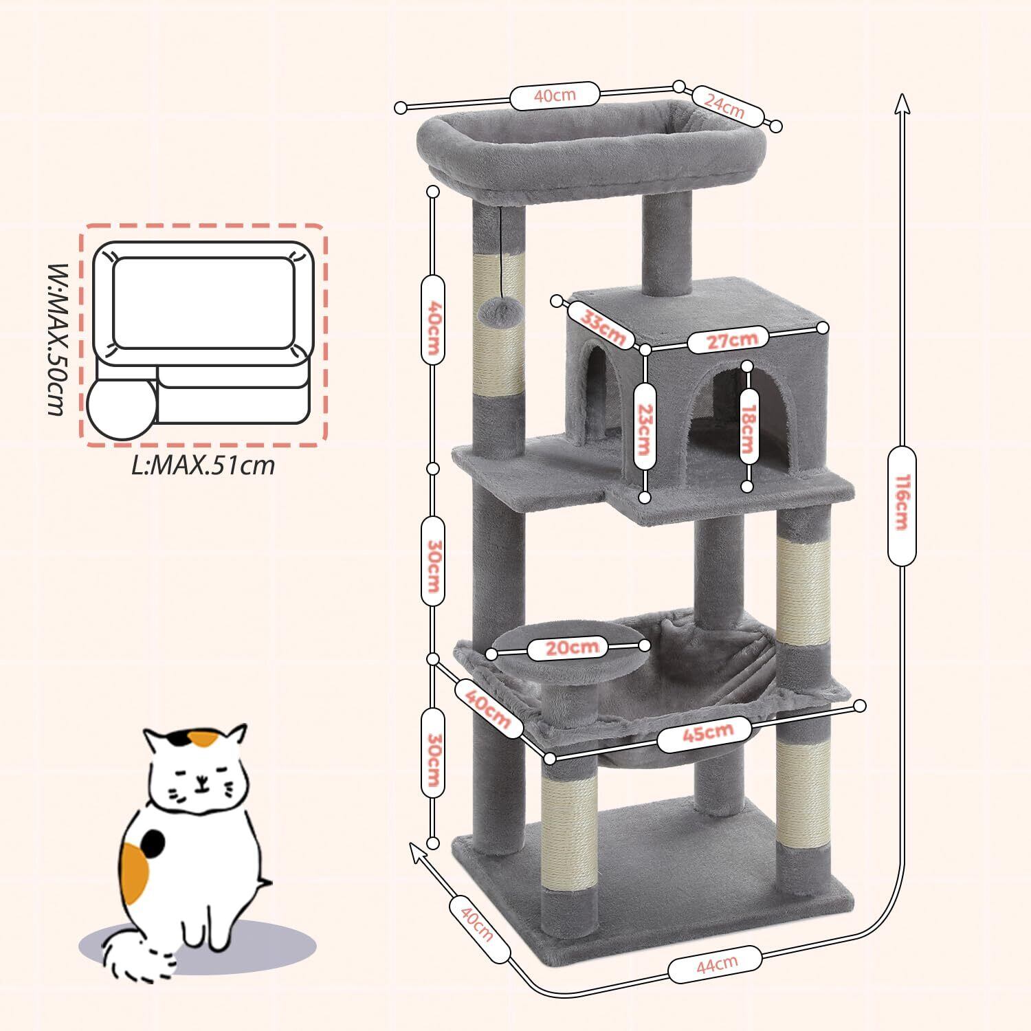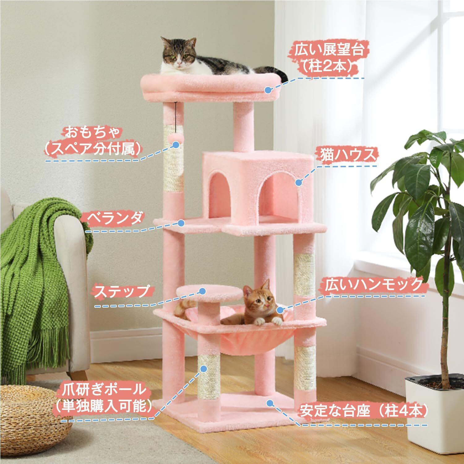 PETEPELA(ぺテぺラ) キャットタワー スリム コンパクト 猫タワー 据え置き 置き型 省スペース ハンモック 爪研ぎ 見晴台 人気 ボンボン 天然麻紐 シンプル 運動不足解消 多頭飼い - ピンク M 高さ116cm