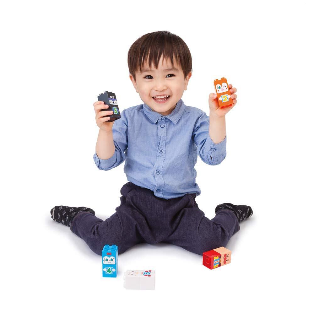 10体のキャラクターブロックの裏には数字が一目で学べるイラスト入りで、はじめてのすうじ遊びにぴったりです。