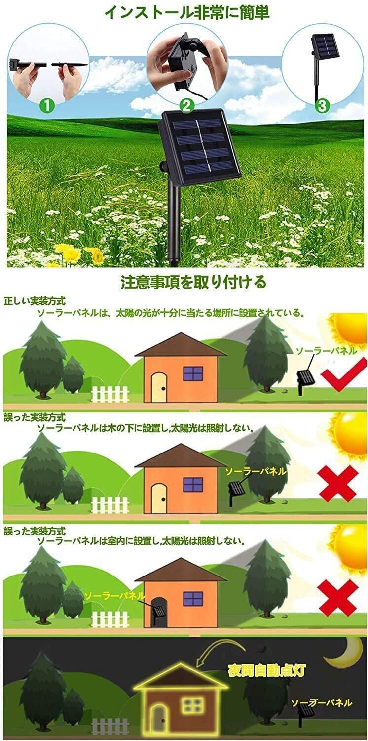 【配線工事不要】地面に差し込むだけで設置完了。自動点灯・消灯なので点け忘れや消し忘れもなく、毎日イルミネーションを楽しめます。イルミネーション初心者におすすめ。 ※ご注意:点灯テストの時、ソーラーパネルを暗い環境に置いてくだい。周りが明るいなら、手または毛布でソーラーパネルを覆いて、点灯できるかどうかをご確認ください。
