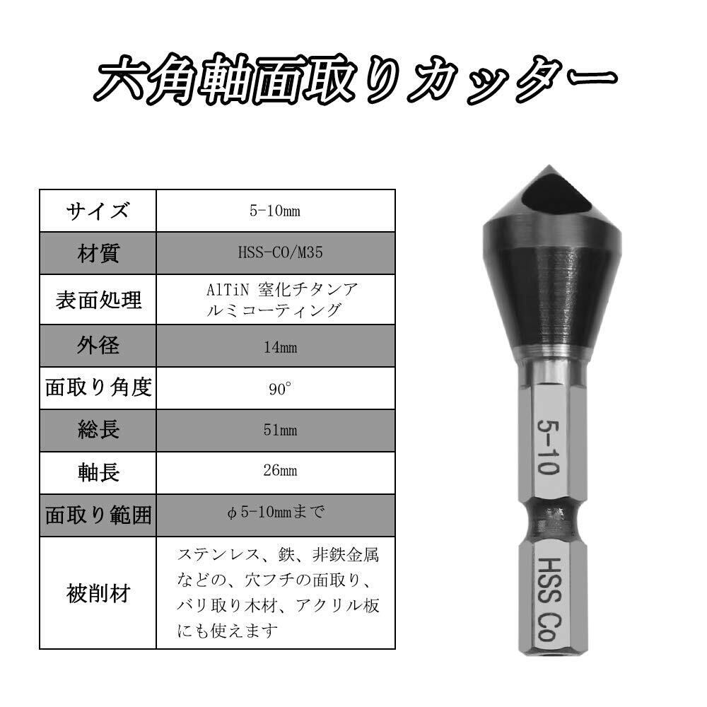 【商品仕樣】面取り角度:90°。材質:コバルトハイス鋼 (HSS-CO/M35)。六角軸:6.35mm。表面処理:AlTiN 窒化チタンアルミコーティング。サイズ:5-10mm。