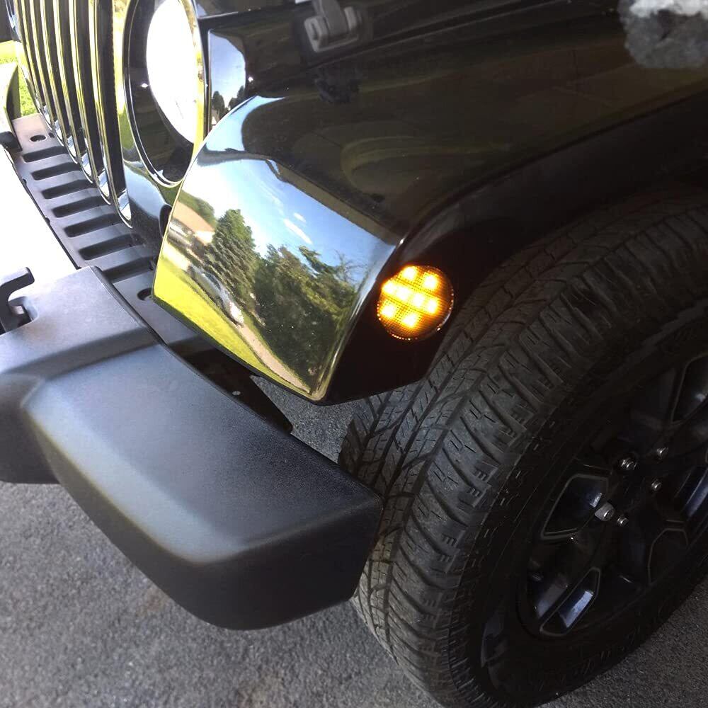 スモークレンズは、ファクトリーフェンダーにほぼ完全に溶け込み、ご愛車に素晴らしいステルスな外観を与えます。琥珀色のLEDが素敵な円形パターンで点灯し、ジープマーカーライトを夜にユニークな外観にします。