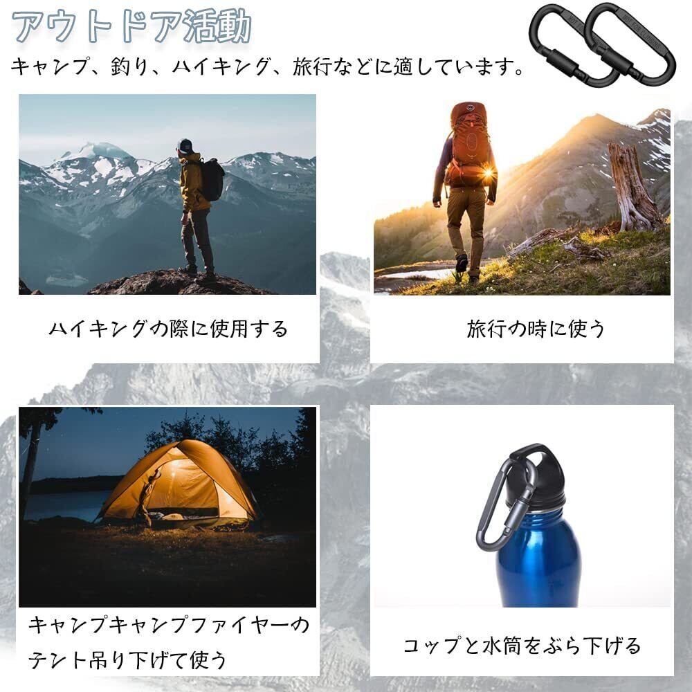 ハイキング/キャンプ/釣りなどのアウトドア活動中に、小さなバッグ、ボトル、小さなトーチをバックパックに掛けるために使用することができます。 また、日常のファッションアクセサリーとして、鍵や水筒、マグカップなどの小物を吊るすのにも大変便利です。[注意】カラビナは小さいので、大きいものや壊れやすいものをぶら下げないでください、登山や大きな安全器具にはお勧めしません。