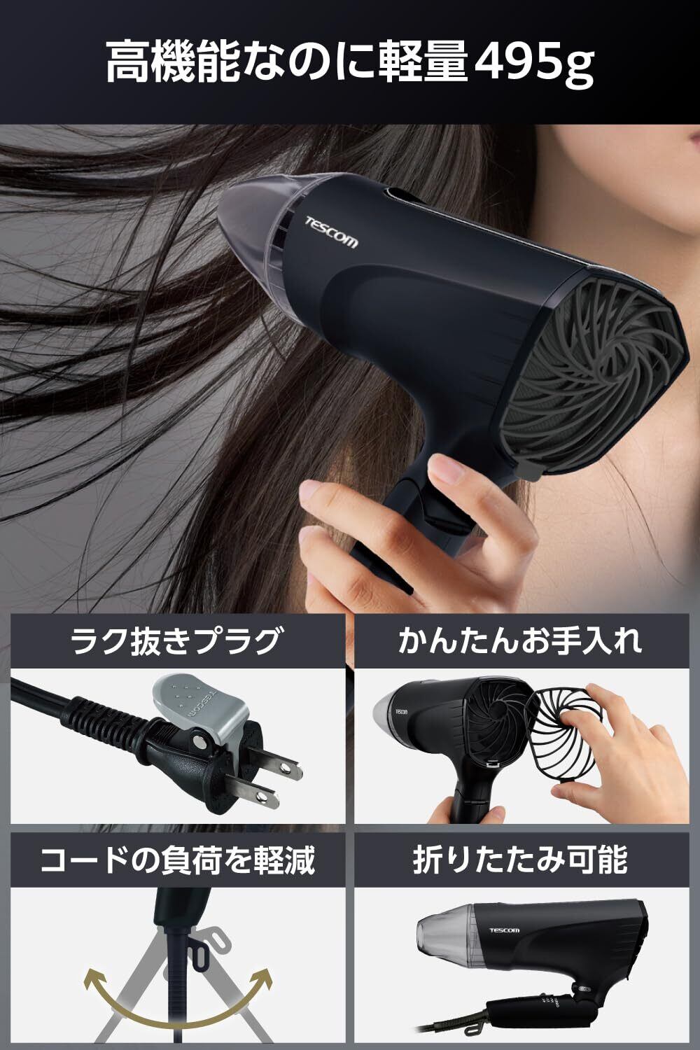 従来機種より12%軽量化!※ 大風量なのに495gを実現。500mlペットボトルよりも軽く、ロングヘアーでも疲れにくい。 ※当社製品TID2250と比較。