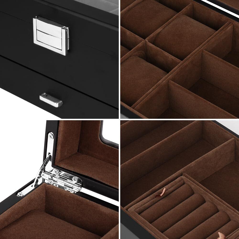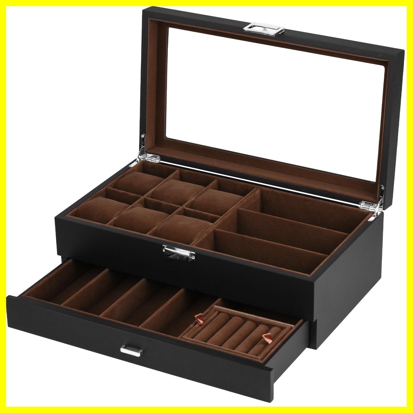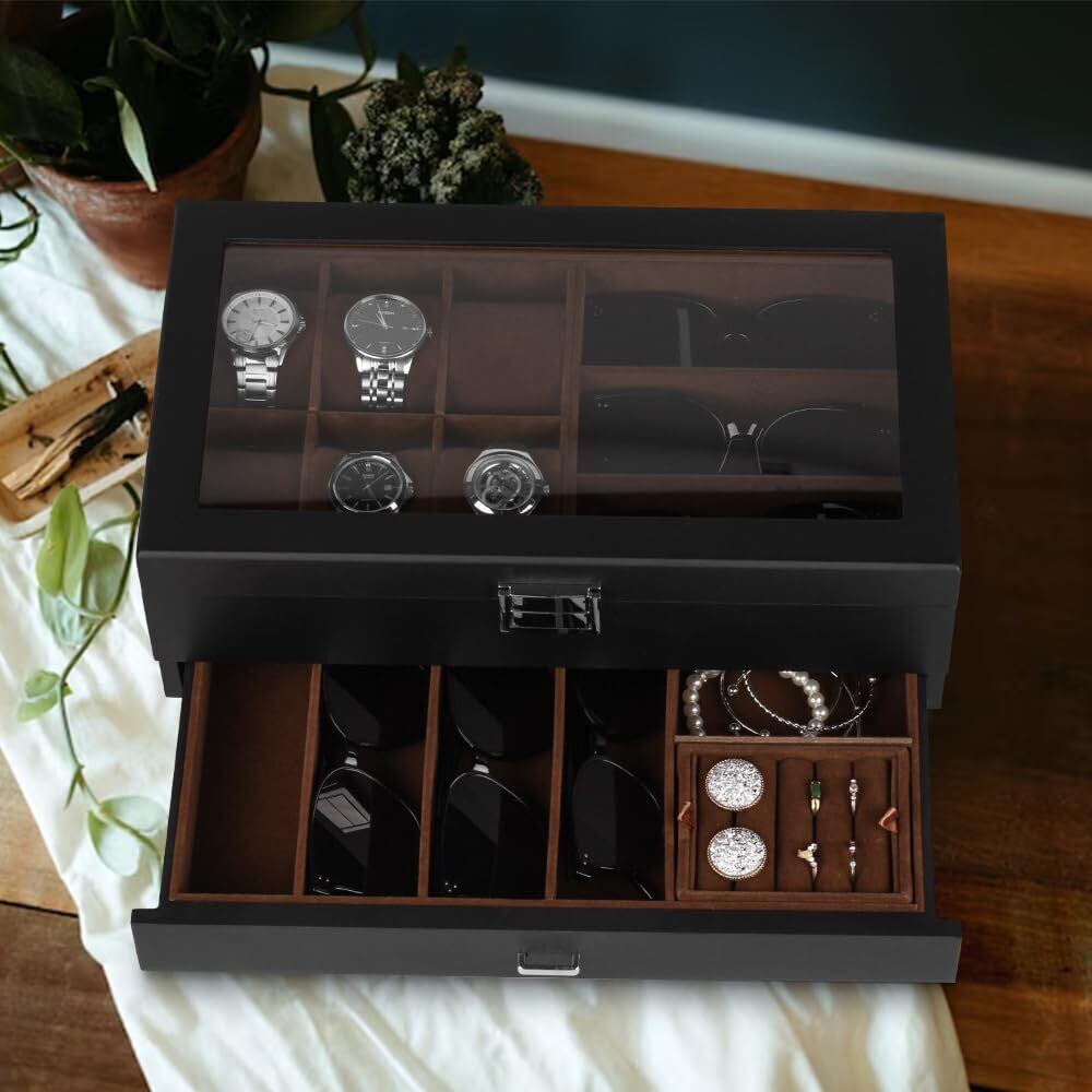 Baskiss 高級2層木製時計ケース 腕時計・眼鏡・ジュエリー収納ボックス 腕時計6本 サングラス7本 アクセサリー・指輪・ブレスレット収納可能 コレクションケース (腕時計6本・メガネ7本)
