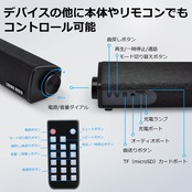 【その他】■電源:USB電源 2000mAh(3.7V) ■充電時間:約3時間 ※充電機器により異なることがあります。 ■連続再生時間:約24時間 ※使用状況・環境条件により異なることがあります。 ■使用温度範囲:5~35℃ ■対応フォーマット:mp3、wav ■対応メディア:microSDカード、microSDHCカード(~32GB) ■外形寸法:約W40×D5.5×H5.5cm ■質量:約533g ■付属品:リモコン、USB充電ケーブル、オーディオケーブル Ф3.5mm、RCA変換ケーブル 【リモコンでの基本操作】●電源ボタンで電源のON/OFFができます。※本体の電源ダイアルがONの場合のみ。本体の電源ダイアルがOFFの状態ではONにできません。 ●音量調整可能です。使用時に音が聞こえない、小さい場合は接続機器の音量やスピーカーの音量を一度ご確認ください。 ※リモコンは無線接続時のみ操作可能です。有線接続時には利用できませんので、ご注意ください。