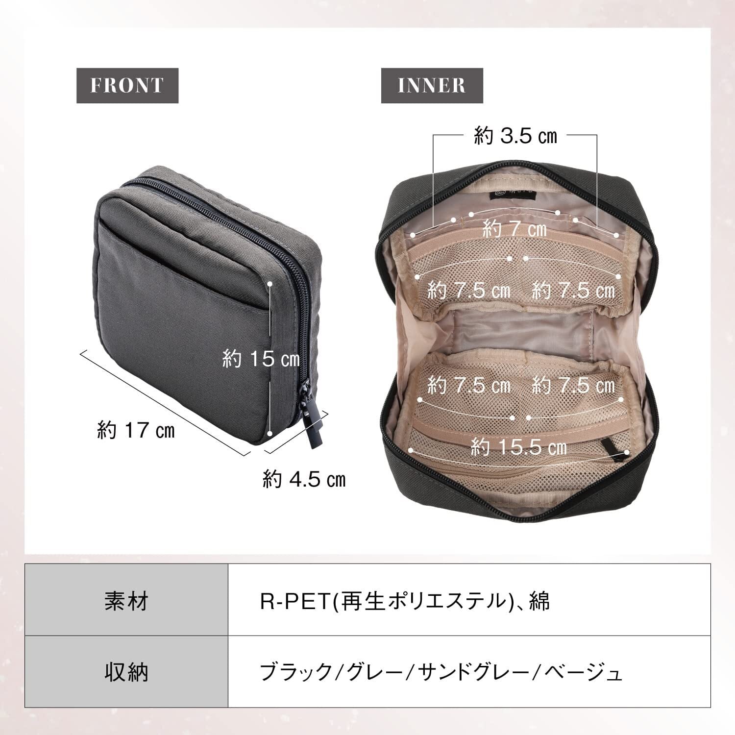 【耐久性抜群の素材】アウトドアバッグにも使わえれる耐久性をそなえた900Dの高密度、高強度素材を採用しております。【シンプルなデザインでシーンを選ばず使える】デザインは極力シンプルに使いやすく、マットブラックのファスナーで大人な雰囲気を印象づけます。内側ポケット×9(メインポケット1、メッシュポケット4、小ポケット3、メッシュファスナーポケット1) 外側ポケット×1 サイズ:約17cm×15cm×4.5cm 本体重量:96g 素材:R-PET(リサイクルポリエステル)