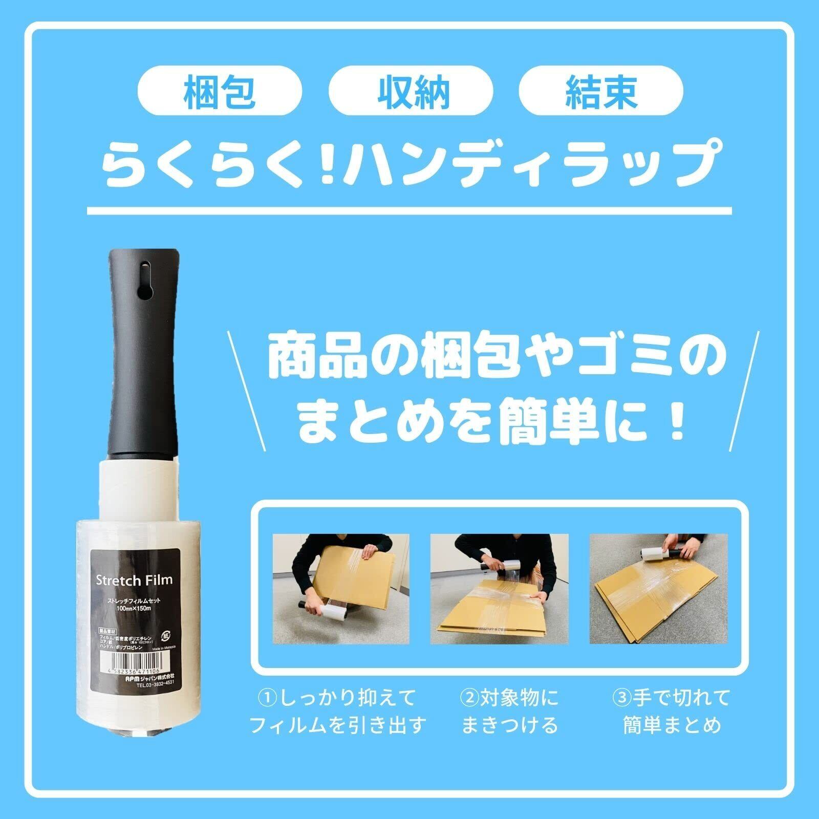 めんどうなまとめる作業を楽にするハンディラップです。業務用梱包ストレッチフィルムと同材質だから強度も抜群!