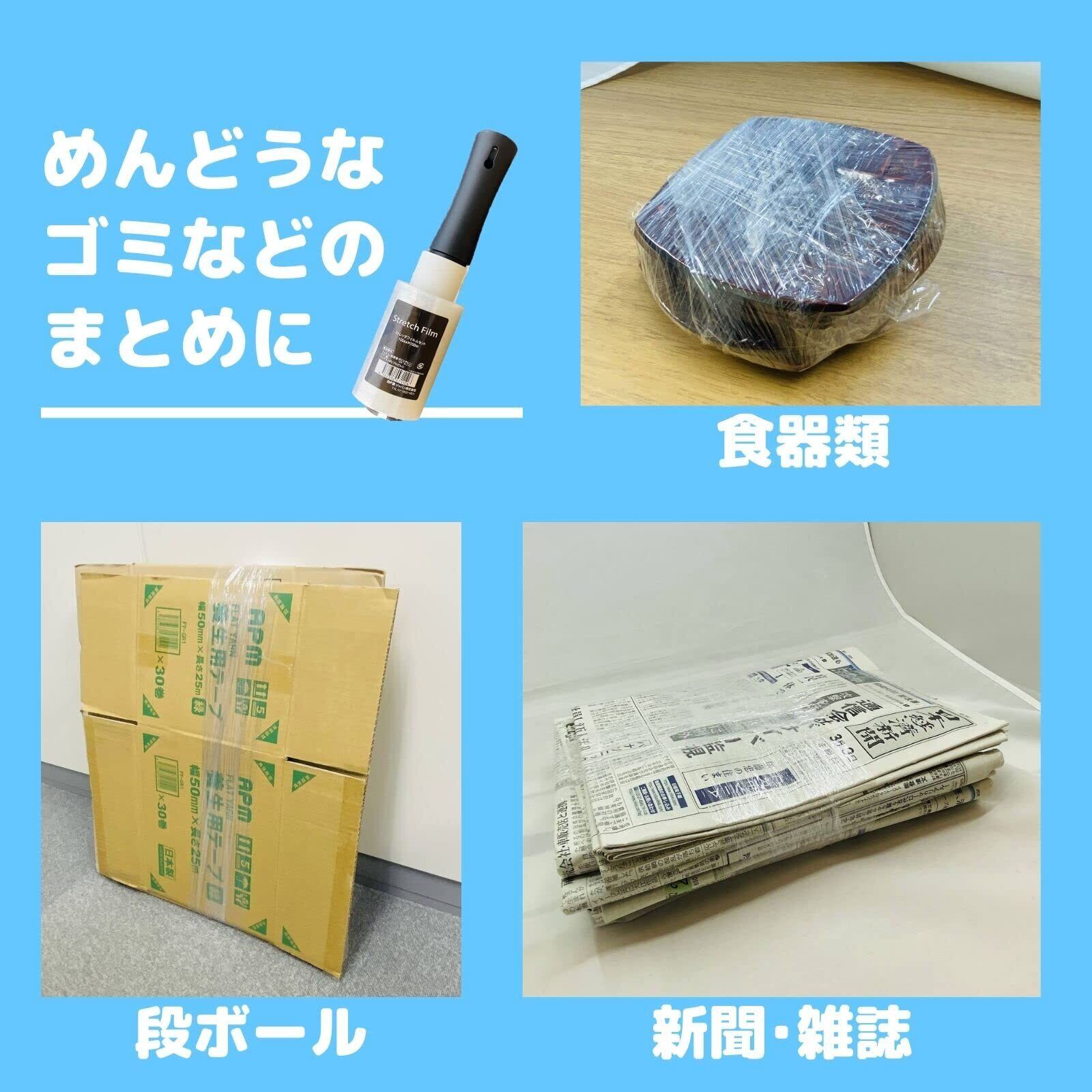 フィルムの長さは150mで引っ越し作業や日常のごみのまとめにもたっぷりつかえてかんたん便利。伸びるビニールなのでまとめづらいものの梱包、収納、保管に最適!