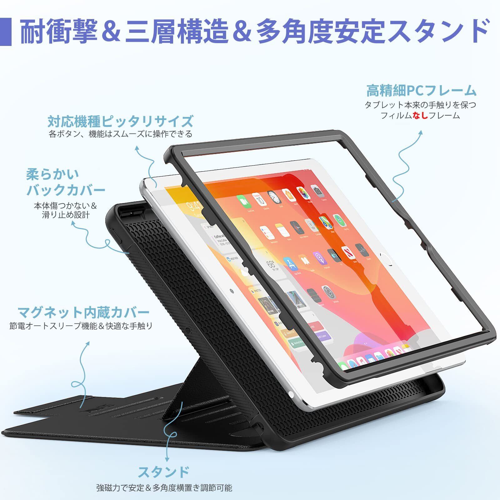 【強磁力】:強力なマグネットが内蔵され、冷蔵庫などの金属面にしっかりと付けられ、ハンズフリーで楽しめます。全体保護ケースは傷、落下や衝撃からiPad第9世代/第8世代/第7世代を守ってくれます。