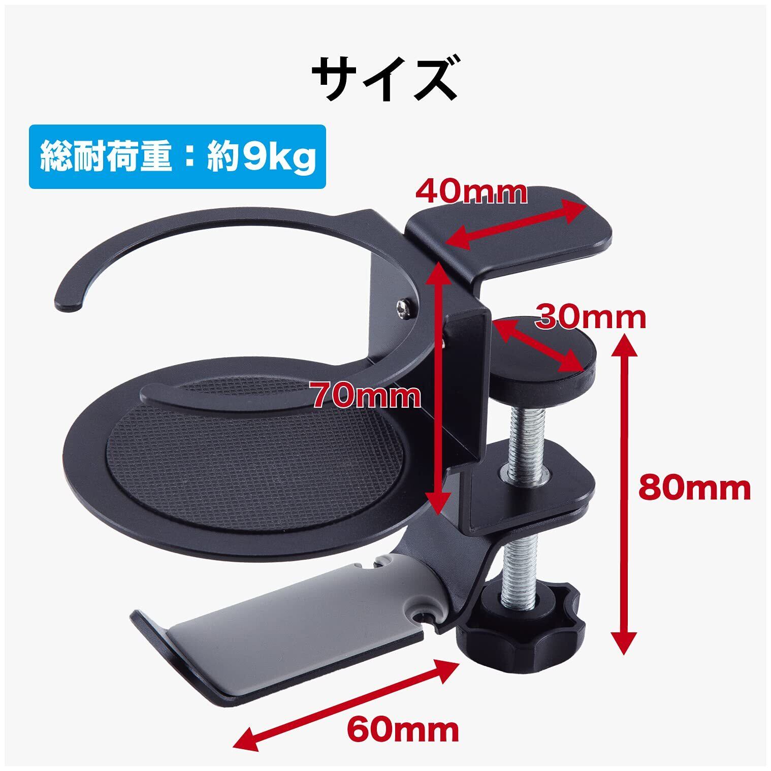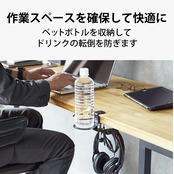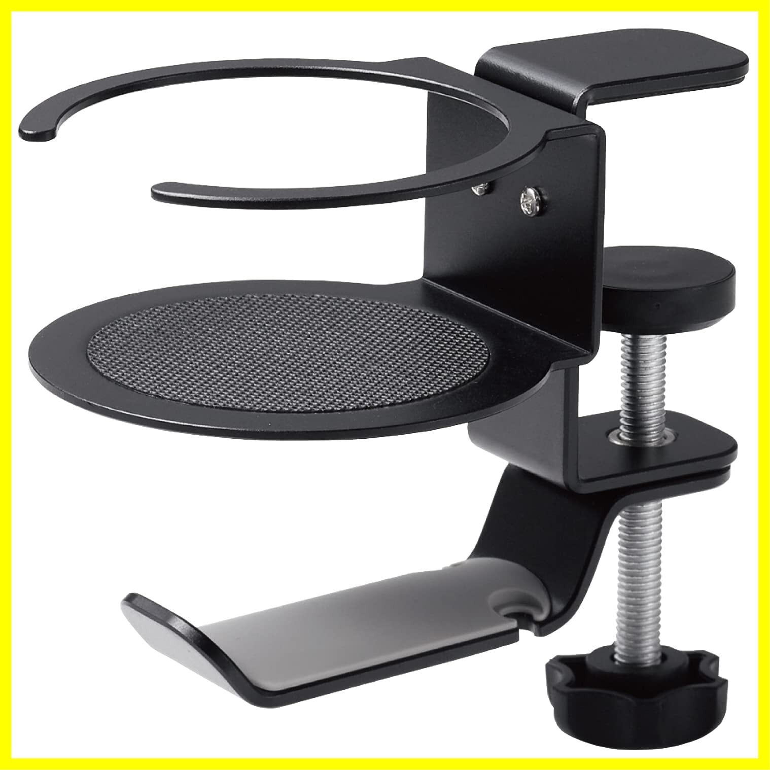 ■ヘッドホンとドリンクをまとめて収納できる、ドリンクホルダー付きのヘッドホンスタンドです。 ■ヘッドホンのハンガー部は360度回転可能でデスク下に収納できるので、使用したいときだけデスク下からヘッドホンを取り出すことができます。 ■クランプ式で、デスク下にしっかり取り付けられます。 ■天板厚み約50mmまでのデスクに対応します。 ■直径約70mmまでのドリンクを置くことができます。 ■ハンガー部にはプラグやコードを引っ掛けることができるフックが付いています。