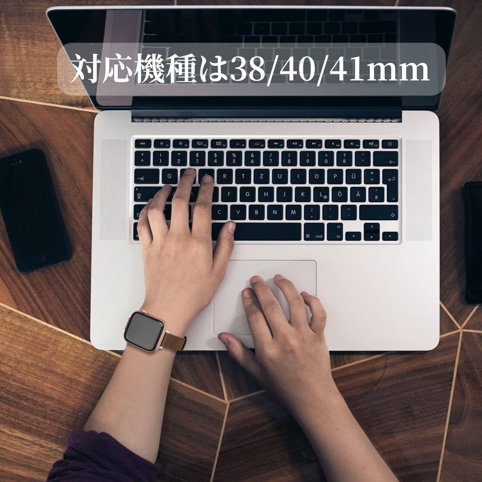 手首サイズに合:わせて調整可能なiWatch Series 9/8/7/6/5/4/3/2/1/SE/SE2対応のレザーバンドです。シンプルで魅力的なデザインでありながら、あらゆるシーンでプロフェッショナルな外観を演出します。対応機種は38/40/41mmで、手首のサイズを確認してご購入ください。(保護カバーは含まれておりませんので、ご注意ください。)