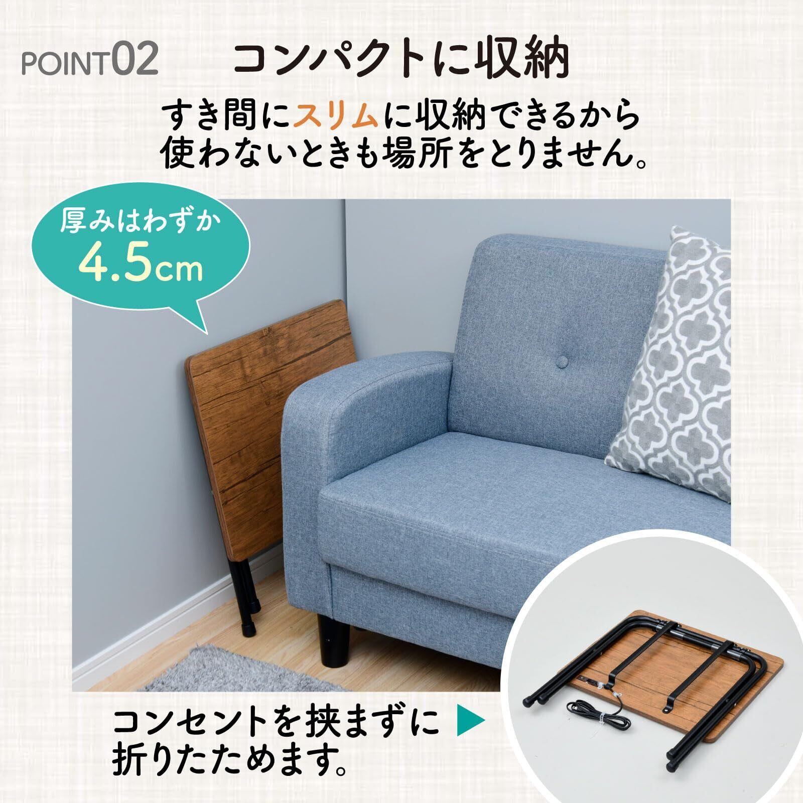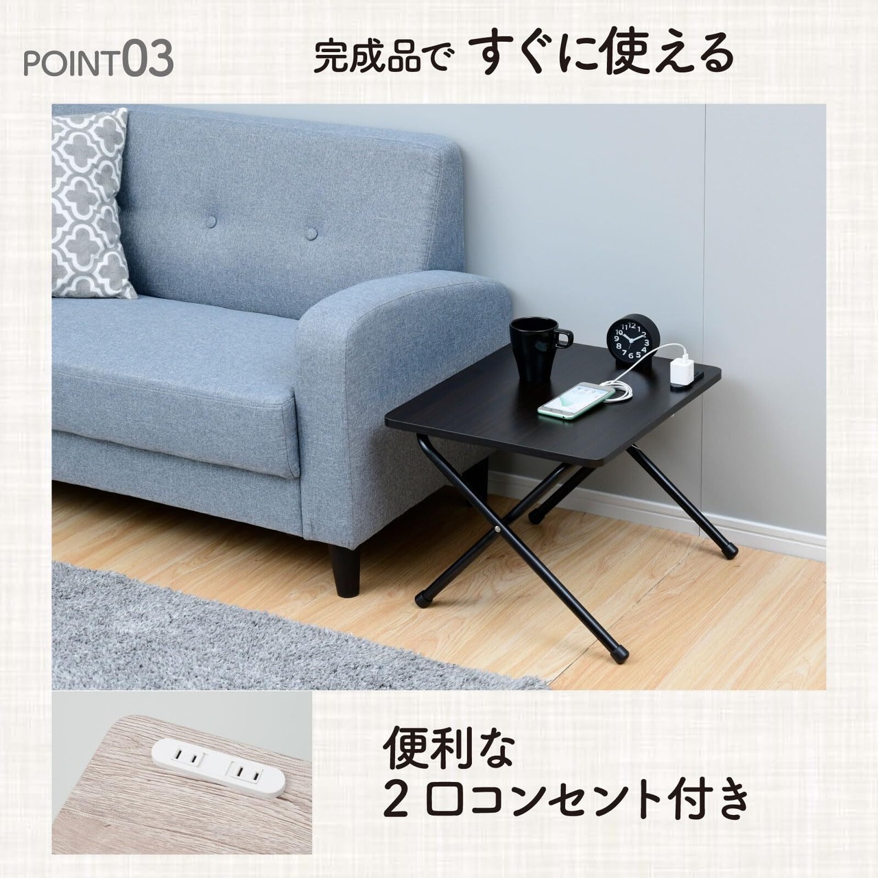 【2口コンセント付き】コンセント付きで、パソコンやスマホの充電もしやすい折り畳み式のローテーブルです。ソファやベッドのサイドテーブルとしても、アイロンやミシンなどの作業台としても使えます。