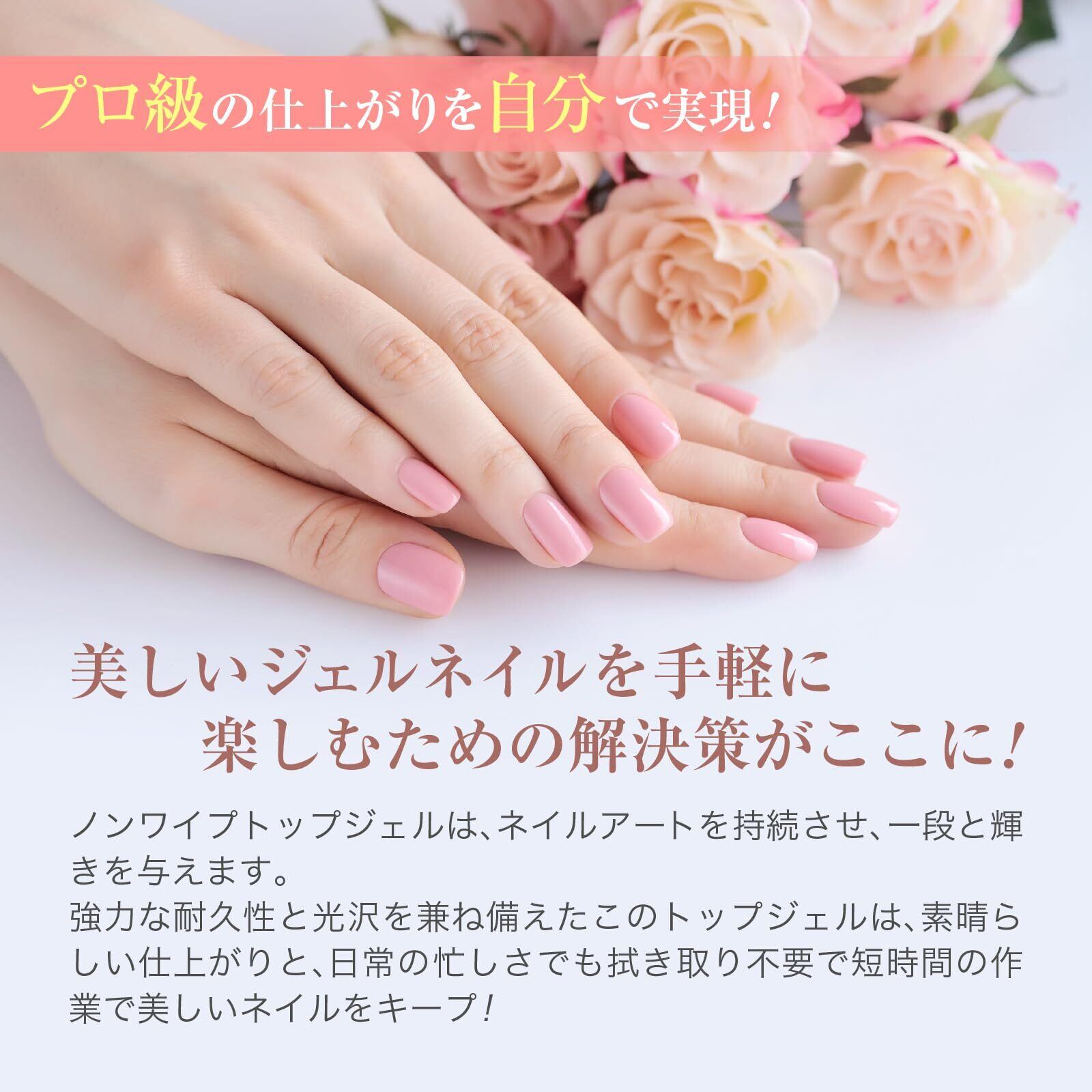 美しさと艶を満足いただけます。プロ仕様で固めにより艶をより高め液だれしない操作性ばつぐんのノンワイプトップジェル! 拭き取り不要で時間短縮!