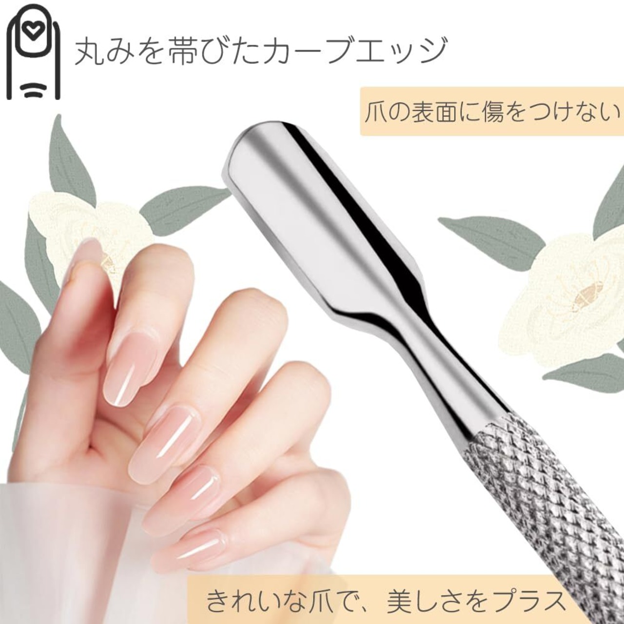 使い勝手の良さ、指先の肌をやわらかくする、古い角質を除去する、仕上がり。爪の表面に傷をつけない、丸みを帯びたカーブエッジ。きれいな爪で、美しさをプラ