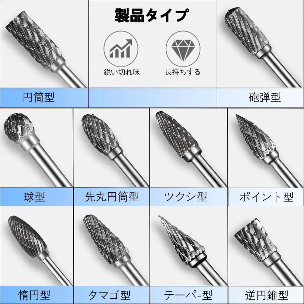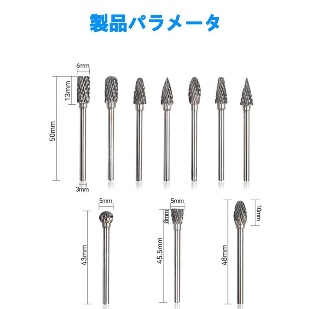 【製品仕様】全長約40~50mm、シャンク径3mm、ヘッド径6mm、材質:タングステン鋼。10種類の異なるヘッド形状を用途に応じて選択可能。