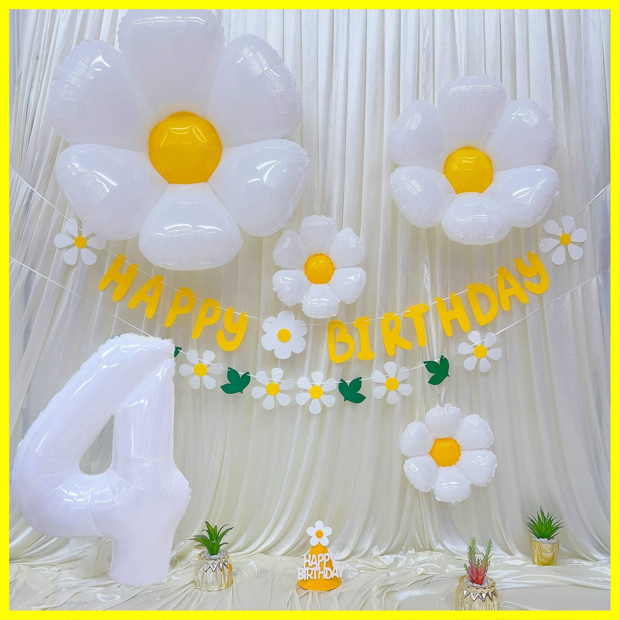 【セット内容】①フェルト布ガーランド×2 ②デイジーバルーン ×4 ③数字バルーン×1 ④三角帽子×1 ⑤リボンひも (10m)