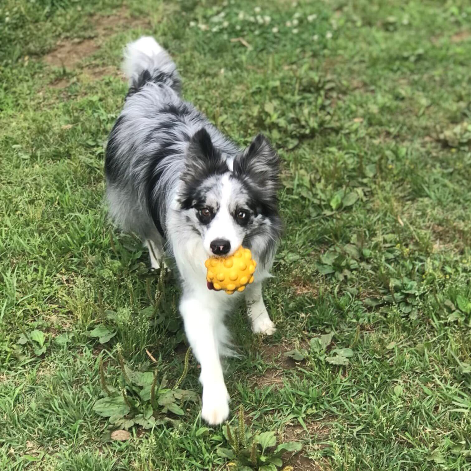 ナチュラルラバー100%の丈夫なボール。表面のデコボコとラバー特有の弾力により、不規則に飛び跳ねます。愛犬の興味を引くスクイーカー付き。