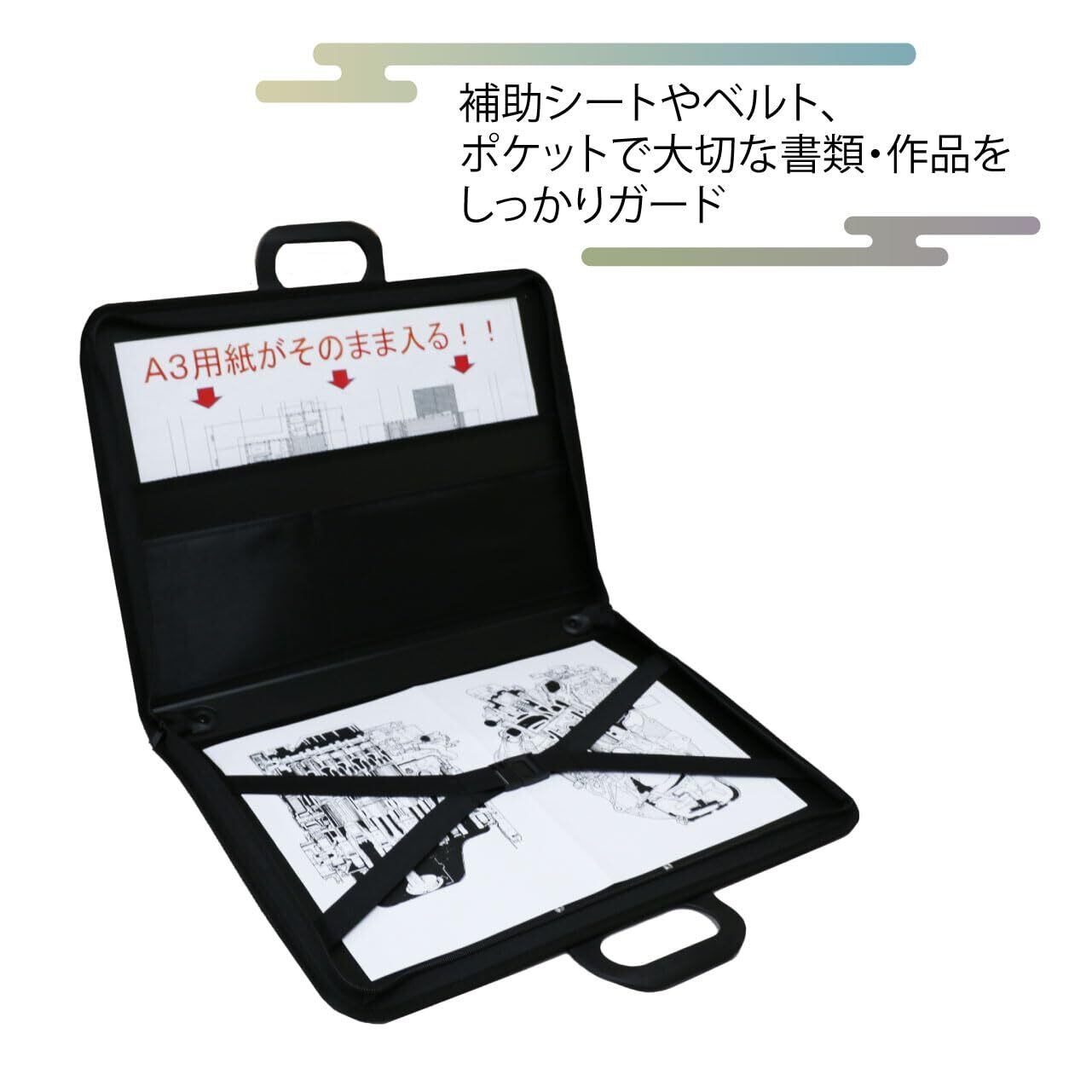 大きな作品・版下・図面も折らずに収納。持ち運びもラクラク。