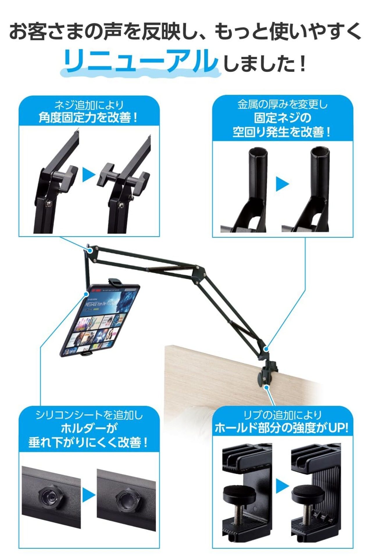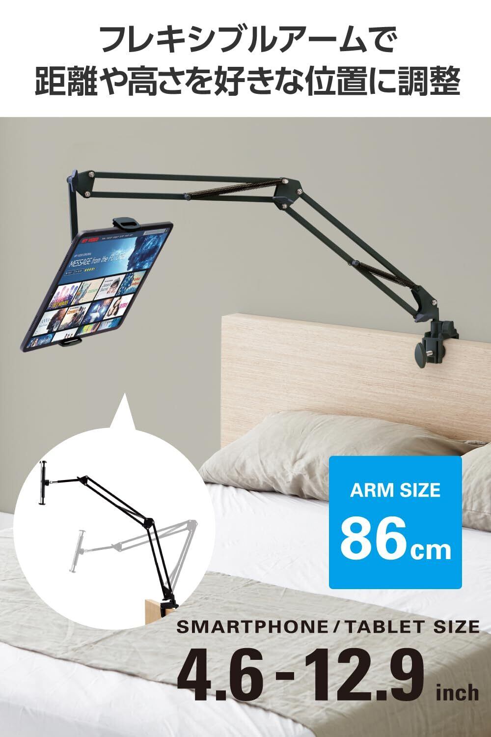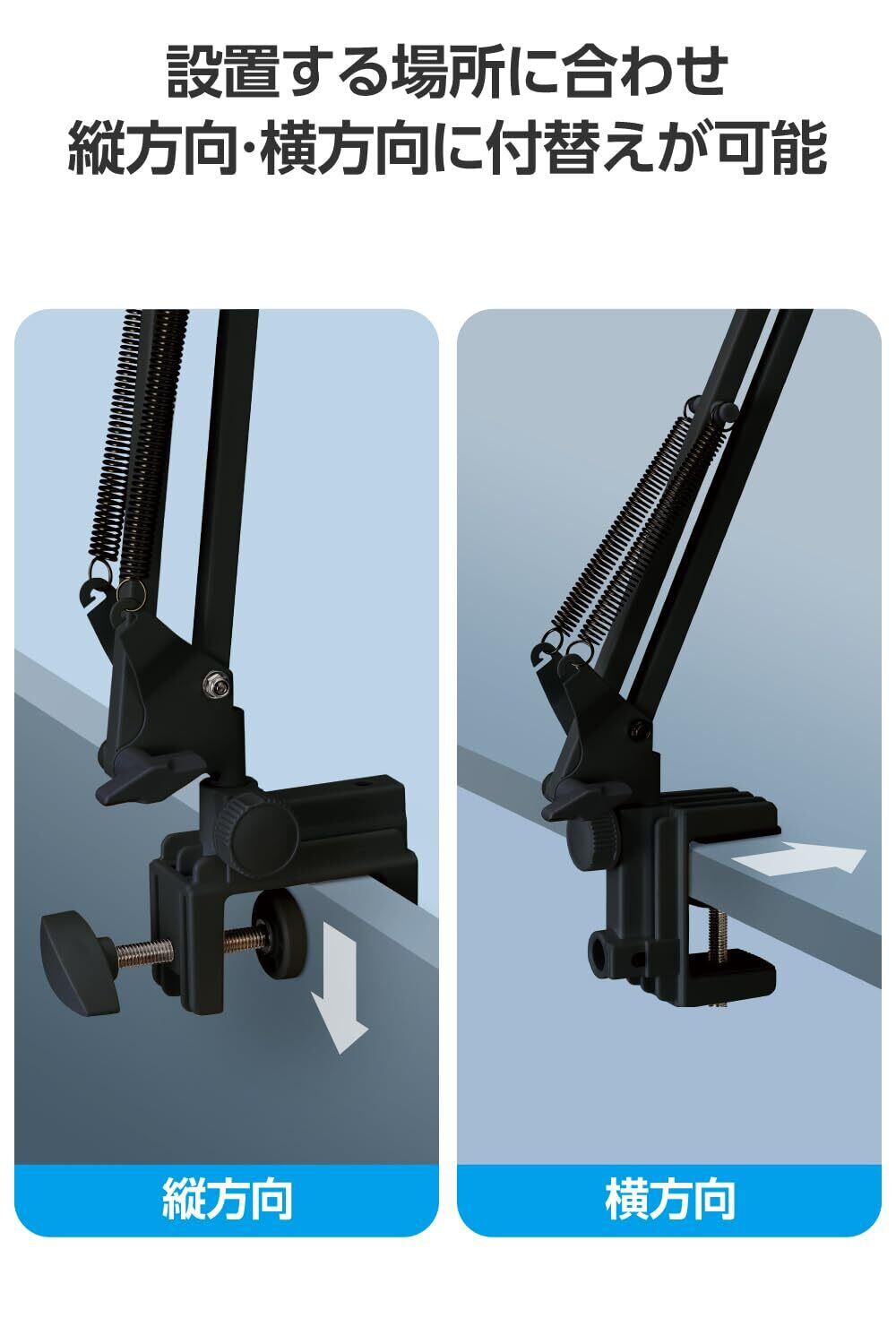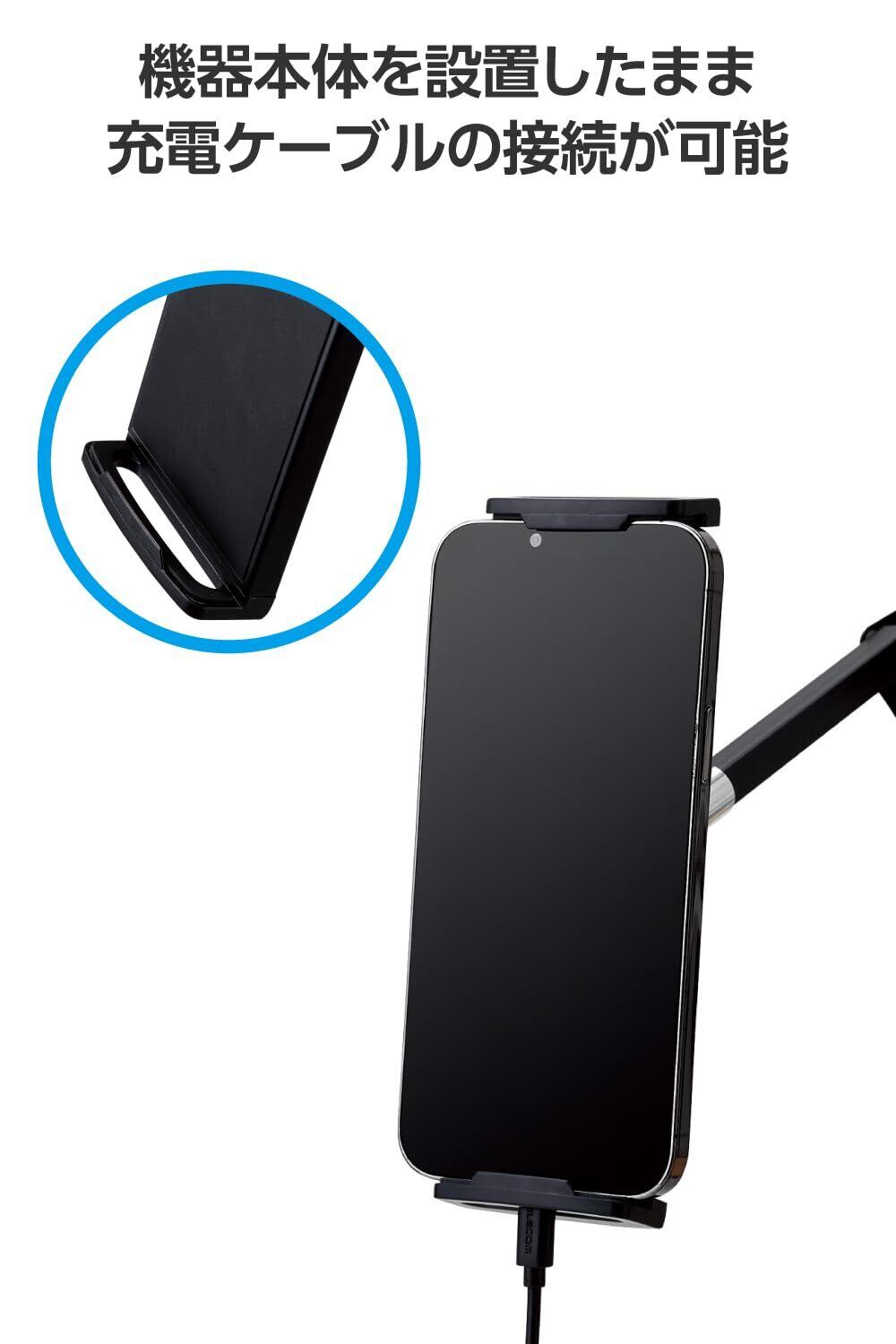 ●縦にも横にも固定できる2Wayのスマートフォン・タブレット用フレキシブルアームスタンドです。●クランプは設置する場所に合わせて、縦方向や横方向に付け替えが可能です。●縦方向に固定するとベッドのヘッドボードに取り付けられるので横になった状態で使用でき、横方向に固定するとサイドテーブルなどにも取り付けて使用できます。●フレキシブルアームと先端アームで、機器本体と顔との距離や高さを好きな位置に調節して使用できます。●ホルダーの接続部分にボールジョイントを採用しているので、角度や向きを自由に調節できます。●機器本体をホルダーに設置したまま充電ケーブルの接続が可能です。●ホルダー部には、機器本体のズレを防ぐシリコン素材の滑り止めが付いています。●4.6~12.9インチのスマートフォンやタブレットに対応しています。●本製品の構造上、機器本体を真下に向けて設置すると、ホルダーから落下する恐れがあるため、必ず角度をつけて設置してください。●※フレキシブルアームの向きを変える際に、アーム最下部のネジの角度によっては、クランプにあるアーム固定ネジと当たることがあるのでご注意ください。●エレコム社環境認定基準を1つ以上満たし、『THINK ECOLOGY』マークを表示した製品です。●環境保全に取り組み、製品の包装容器におけるプラスチック重量を、社内基準製品より20%以上削減した製品です。
