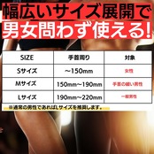 【男女問わず使える!幅広いサイズ展開】SからLまで、3種類のサイズがラインアップ。女性レディースから選手クラスの極太な手首まで、誰でもぴったりフィット。一般的な男性であれば基本的にはLサイズでOK! ◆Sサイズ:手首周り ~150mm(女性用) ◆Mサイズ:手首周り 150mm~190mm(手首の細い男性) ◆Lサイズ:手首周り 190mm~220mm(一般男性)