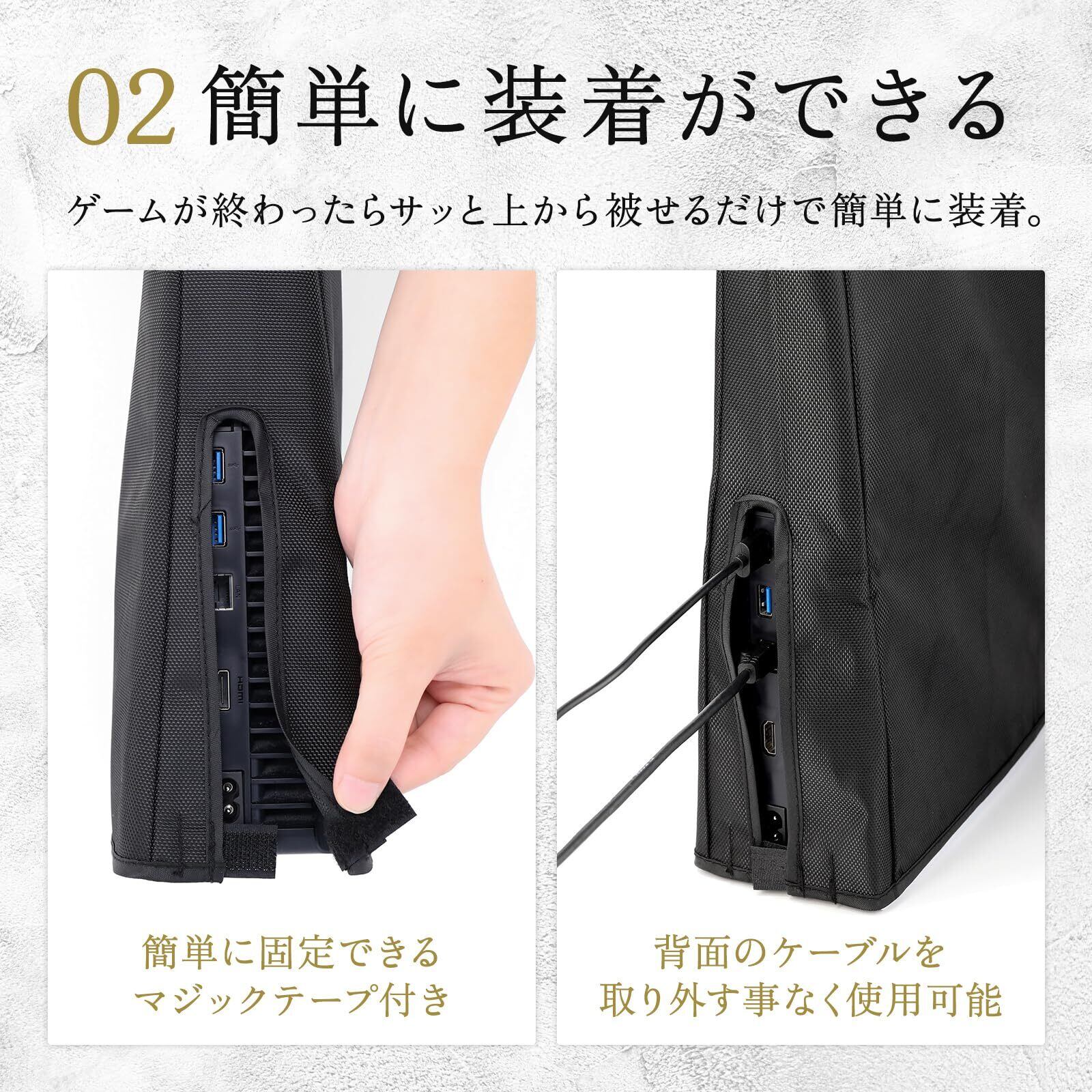 簡単装着:ピッタリ専用サイズで設計されているので、上から被せるだけでPS5本体をスマートに保管できます。カバーの着脱も手軽にできます。