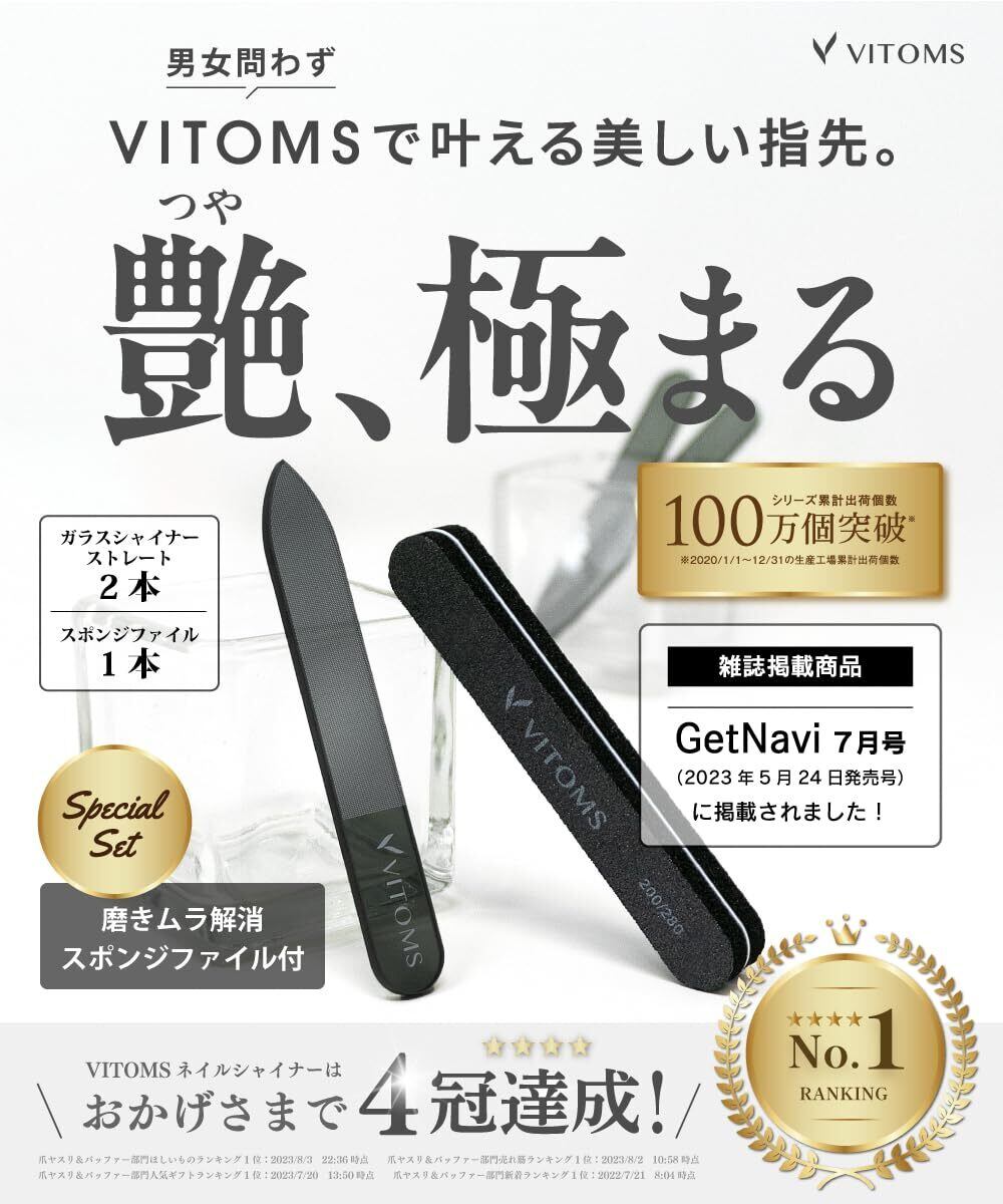 【プロネイリスト推薦】[VITOMS ネイルシャイナー(解説動画付)] こだわり仕様のつめみがき・つめやすり。キメの細かいヤスリ目が、爪の表面にワックスがけしたようなツルツル・ピカピカの輝きを与えます。爪みがきとしてだけでなく、爪の先端を整えるなど爪ヤスリとしてもご利用いただけます。/品質、デザイン、ケースの細部までこだわりました。プレゼントやギフトにもピッタリなパッケージでお届けいたします。※本商品は雑貨です。