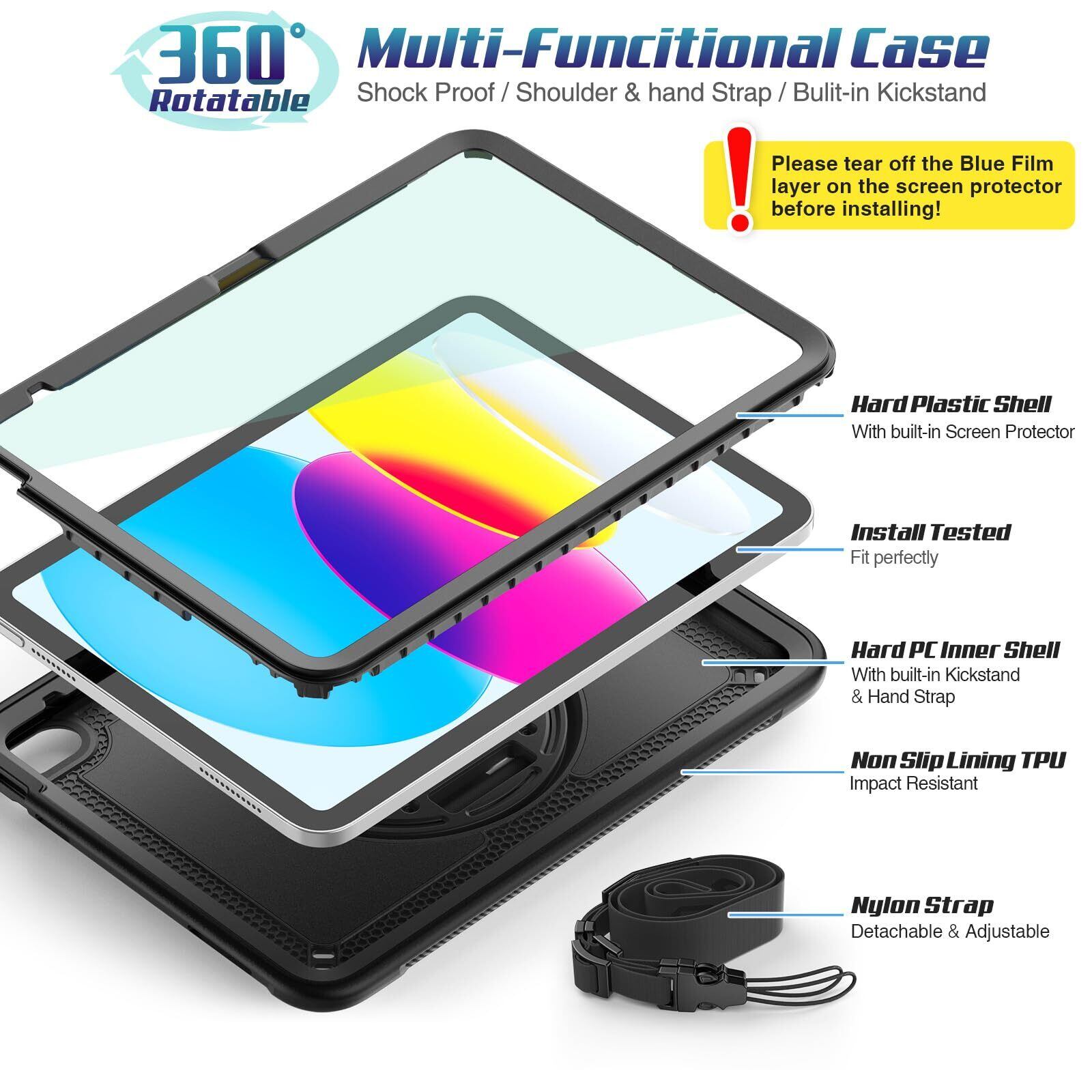 SEYMAC stock iPad A16 第11世代11インチ/第10世代10.9インチ専用ケース 耐衝撃 Gフック式ハンドストラップ 360°回転スタンド ペン収納 ショルダーストラップ フィルム付き前面フレーム 全面保護カバー (ブラック)