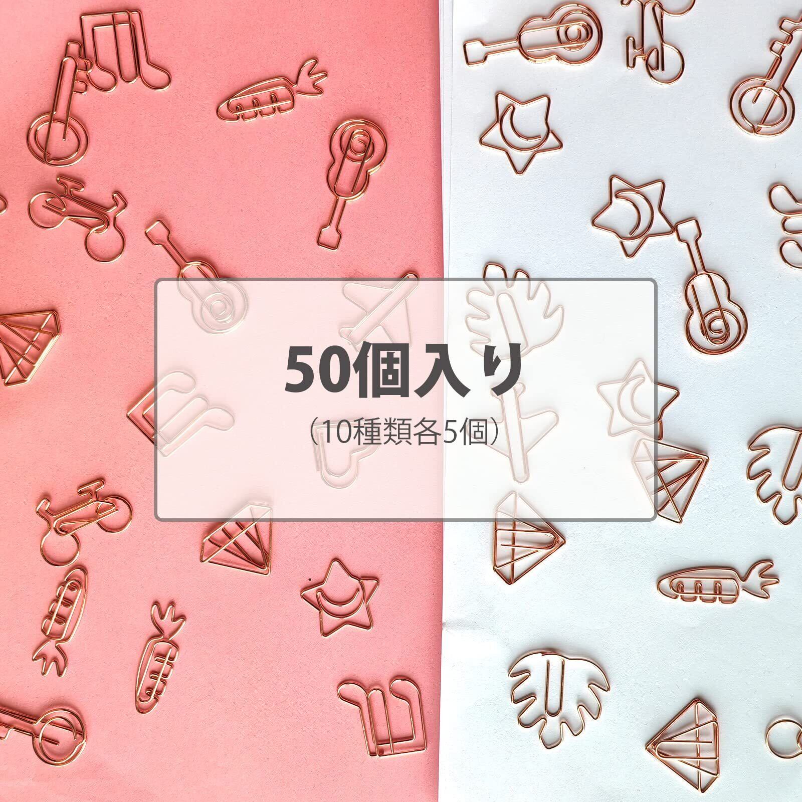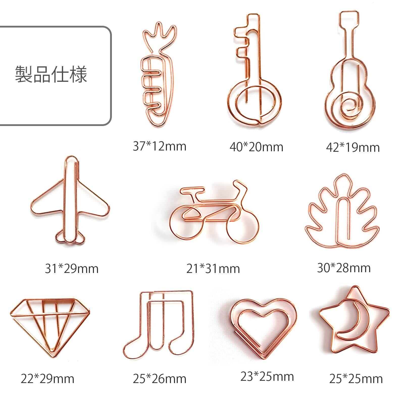 【製品仕様】●セット内容:ペーパークリップ50個入り(10種類各5個)、収納ケース付き;●10種類:ギター、ハート、月星、自転車、葉、鍵、音符 、人参、ダイヤ、飛行機;●サイズ:寸法図を参照してください;●素材:金属+電気メッキ;●線径:約1mm;●色:ピンクゴールド