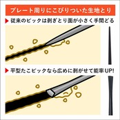 傷つけにくい耐熱樹脂製ピン。先端を平型にすることによりプレートの周りにこびりついた生地をとれやすく