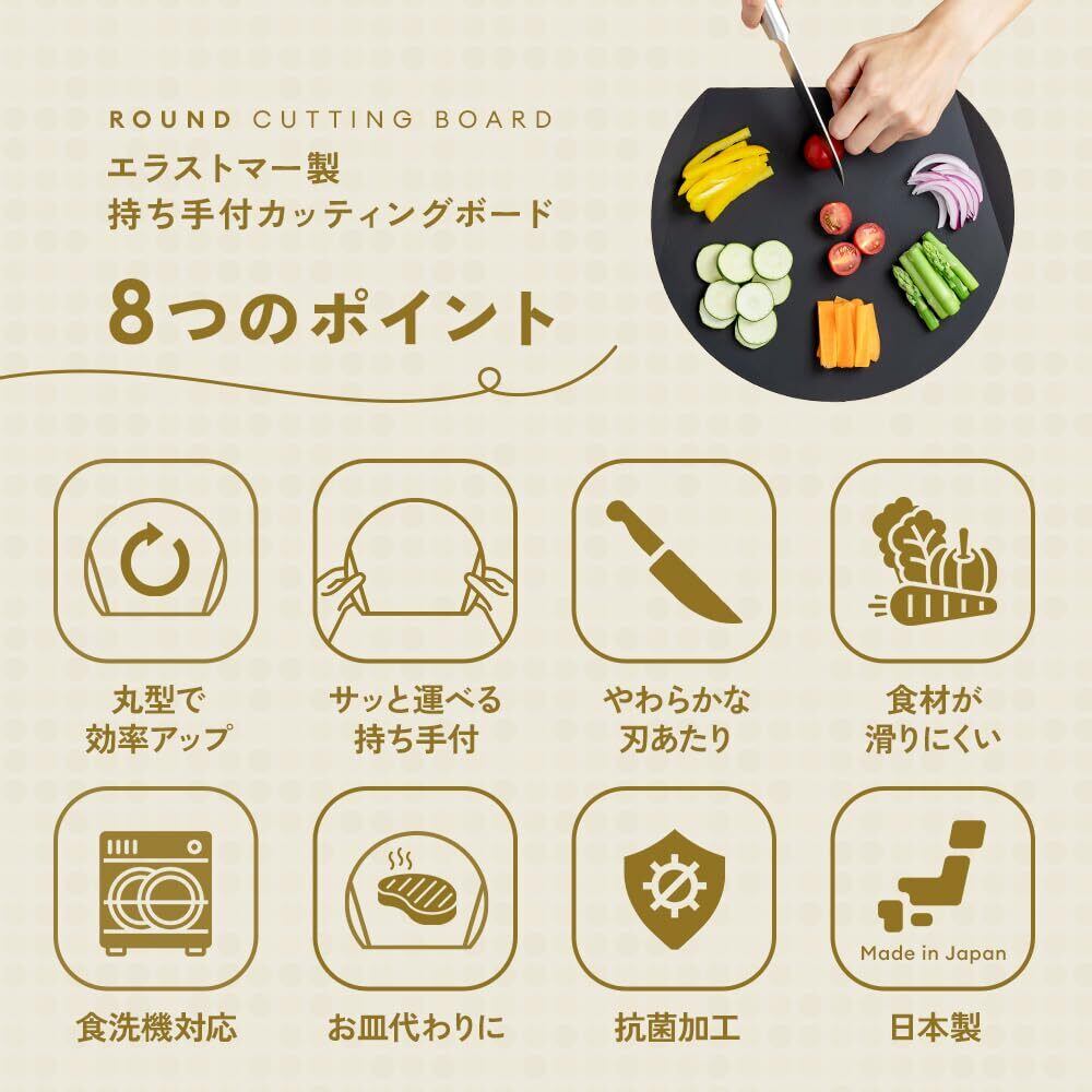 【持ち手付きカッティングボード】人気の丸いまな板シリーズに「持ち手付き」が登場。両サイドに持ち手がついているのでサッと持ち上げやすくなり、食材をカットしてフライパンへ入れる動作がよりスムーズに。キッチンから食卓への移動もしやすく、料理を盛り付けてそのまま食卓へ。カッティングボードやお皿としてもより使いやすくなりました。シンプルで上質感のあるブラックで、盛り付けるだけでお洒落な雰囲気になり、料理を華やかに引き立てます。