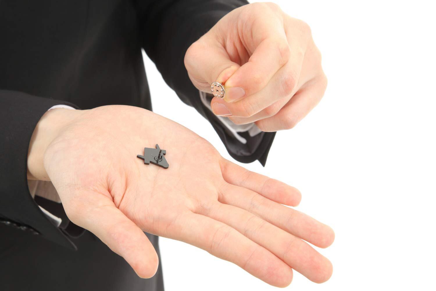 【簡単取り付け】バタフライクラッチ仕様で、スーツやバッグ、帽子にしっかり固定可能。