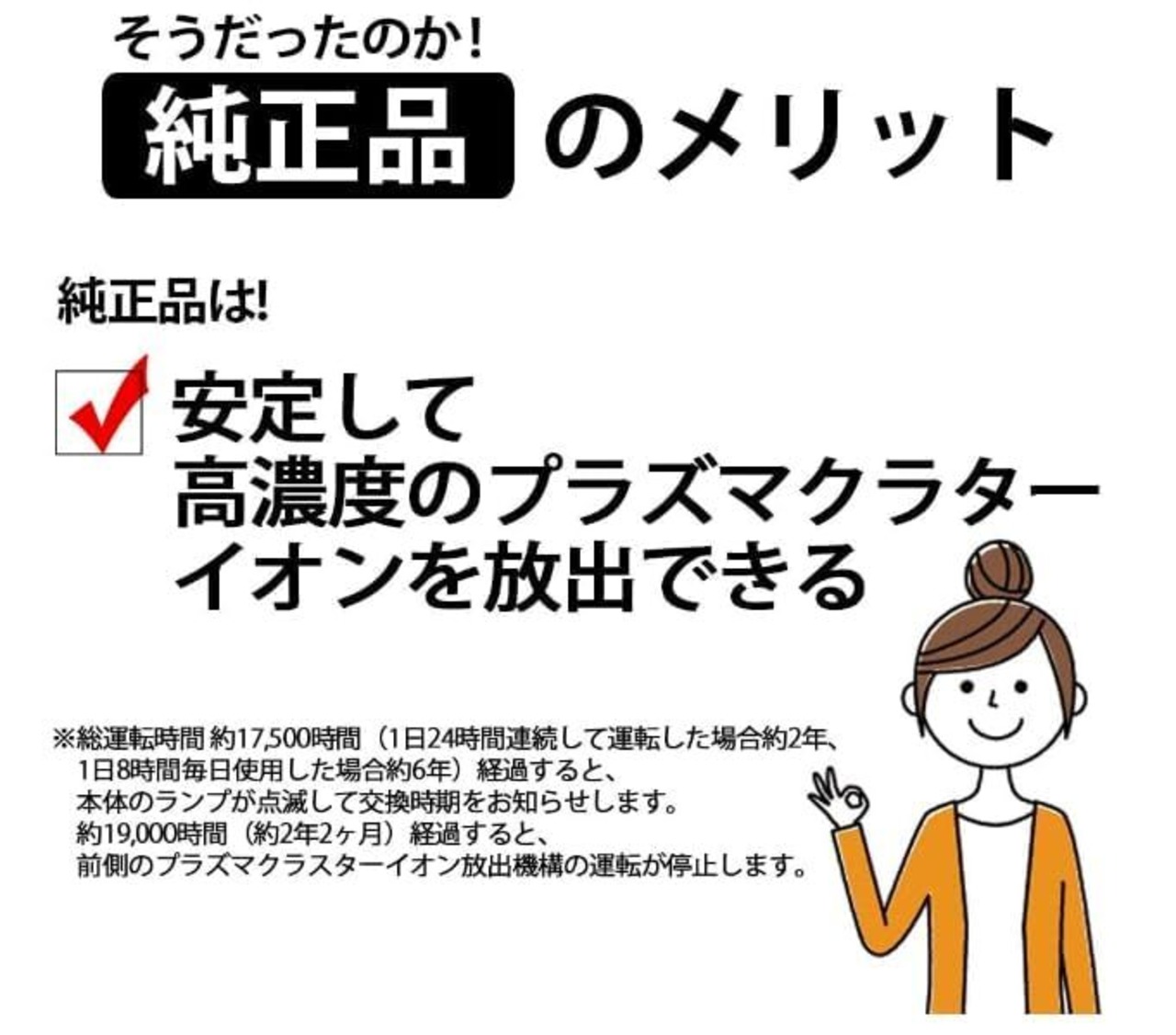 総運転時間:約17,500時間(1日24時間連続して運転した場合約2年、1日8時間毎日使用した場合約6年)経過すると、本体のランプが点滅し交換時期をお知らせします。 約19,000時間(約2年2ヶ月)経過するとプラズマクラスターイオンの放出を停止します。