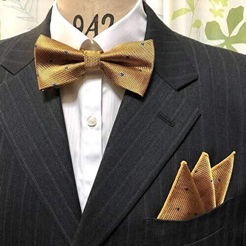 ドット(小)イエロー ゴールド【蝶ネクタイ&ポケットチーフ】2点セット リボン メンズ ワンタッチ セットアップ フォーマル 柄 結婚式 二次会