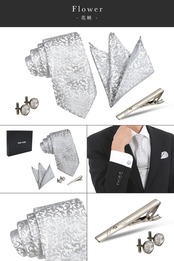 【ネクタイ・ネクタイピン・ポケットチーフ・カフスボタンがセットになった4点セット】 ネクタイ・ネクタイピン・ポケットチーフ・カフスボタンがセットになったとてもお得な4点セットです シルバー系を中心にシンプルでかっこいいデザインを販売しております