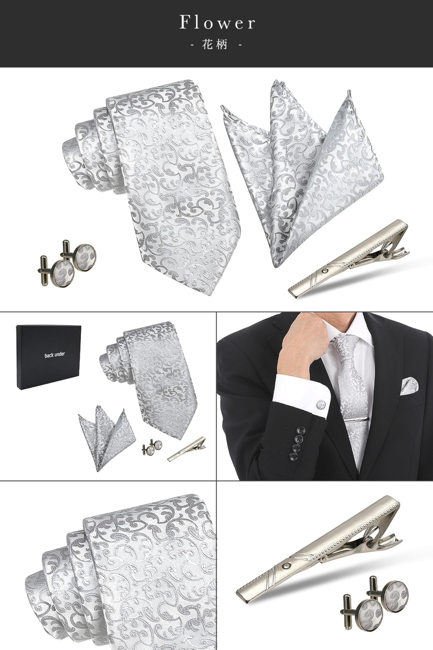 [back under] ネクタイ 4点 チーフ セット 結婚式 シルバー メンズ ネクタイセット グレー タイピン ポケットチーフ カフス ボタン ギフト箱付