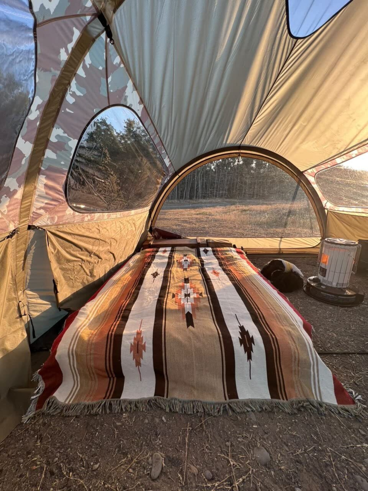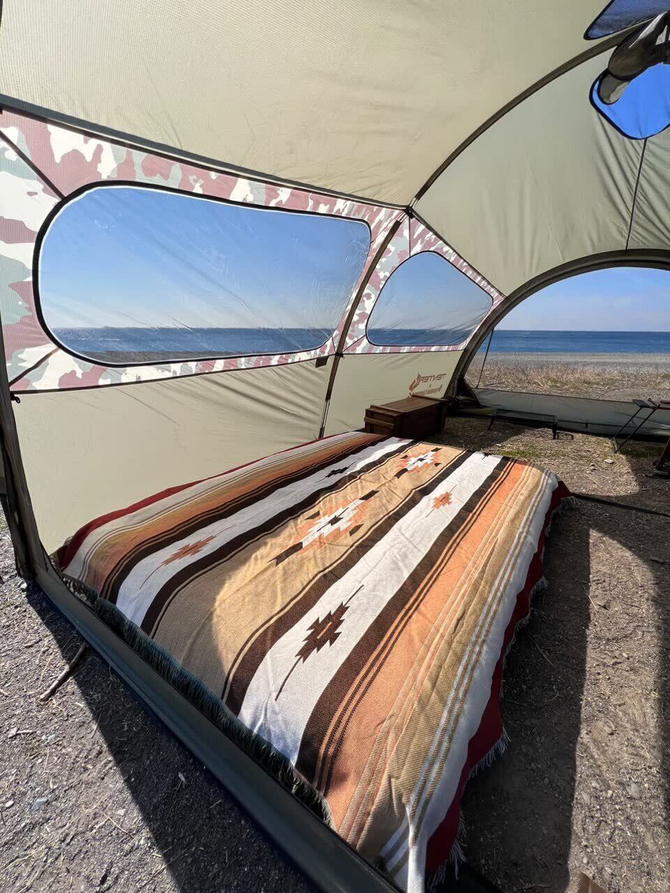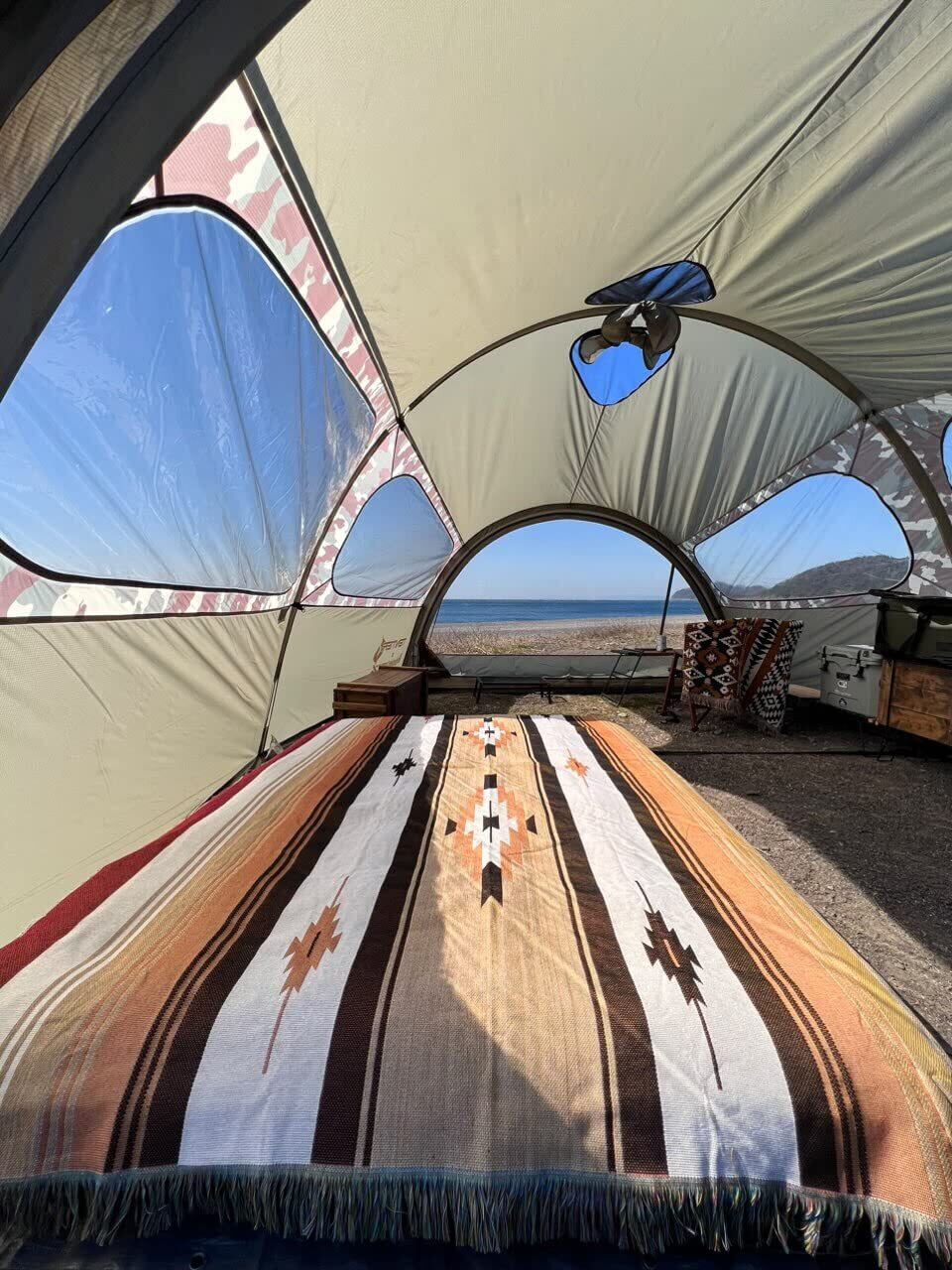テーブルクロスとして活用しているキャンパーもたくさんいます。アンティーク調のキャンプ用品を置くことで、気分はネイティブアメリカン!