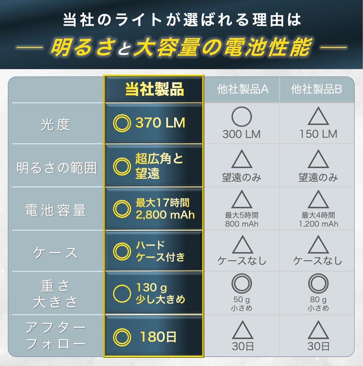 重さは約130g:超高光度・大容量にも関わらず、約130gの重さです。頭に長時間装着していても、負担になりづらく、持ち運びも簡単にできます。