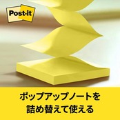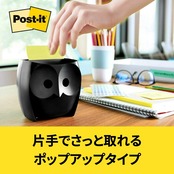片手でサッと簡単に、一枚ずつ取り出せる、ポップアップ式。最後の一枚までムダなく使える。電話やパソコン操作中などの、メモやメッセージにとっても便利。