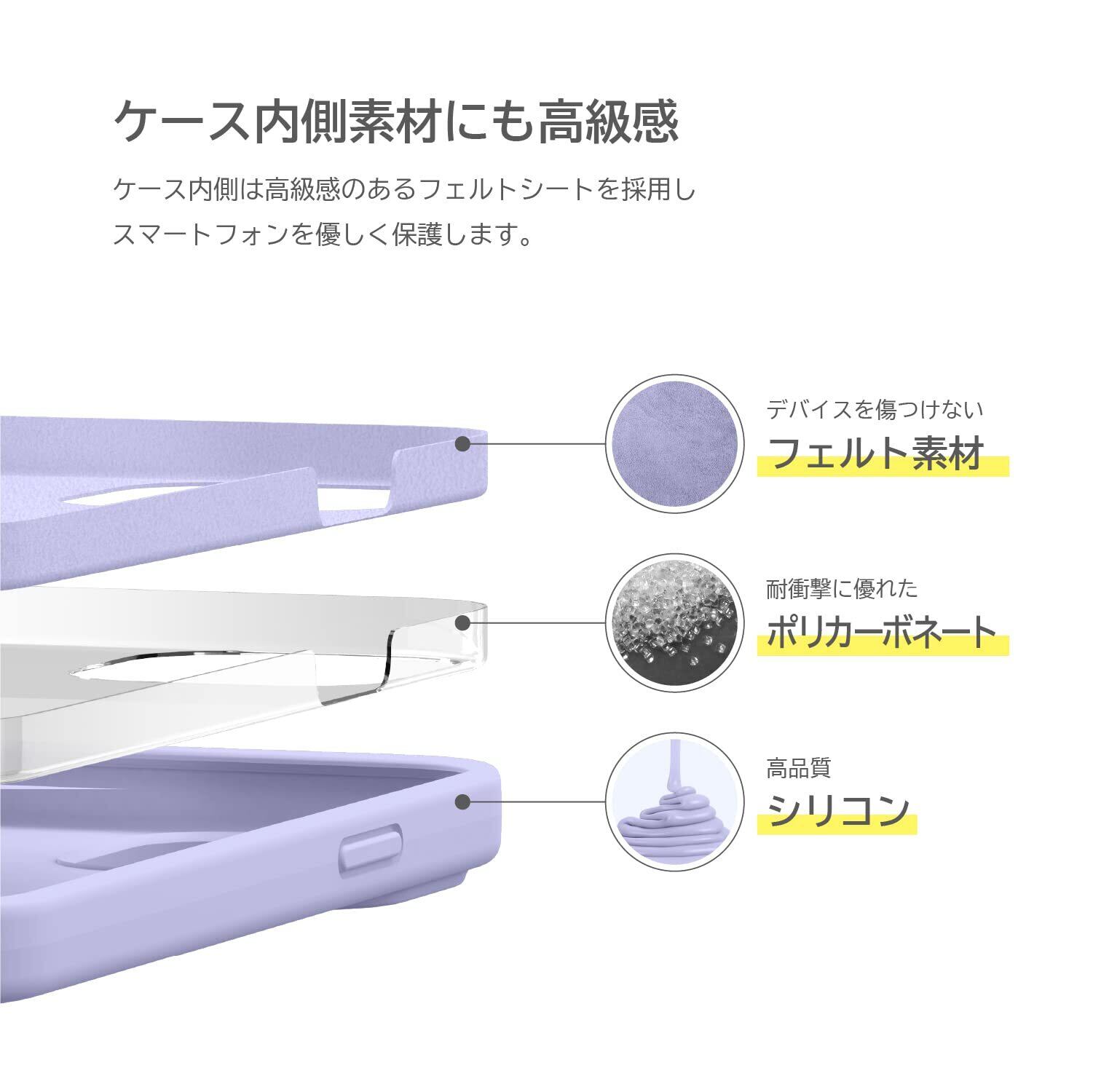【ケース内側素材にも高級感】… ケース内側は高級感のあるフェルトシートを採用し、スマートフォンを優しく保護します。