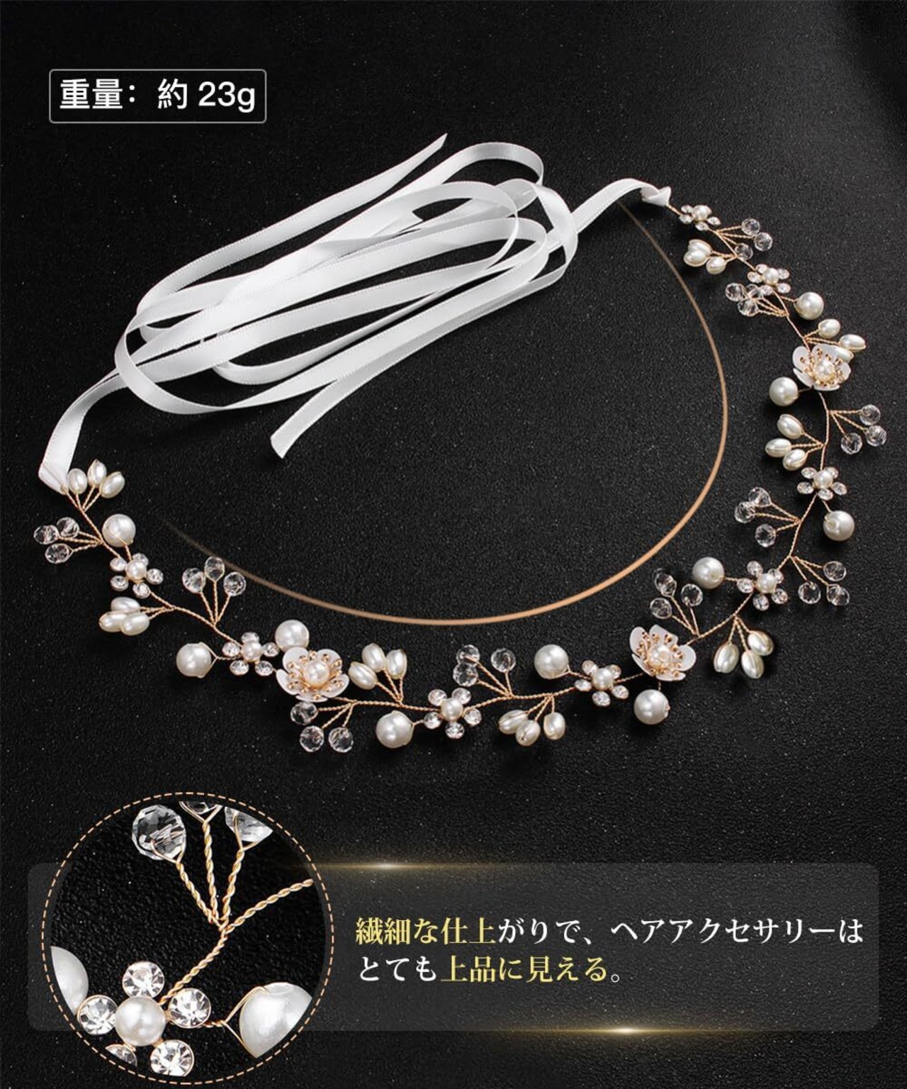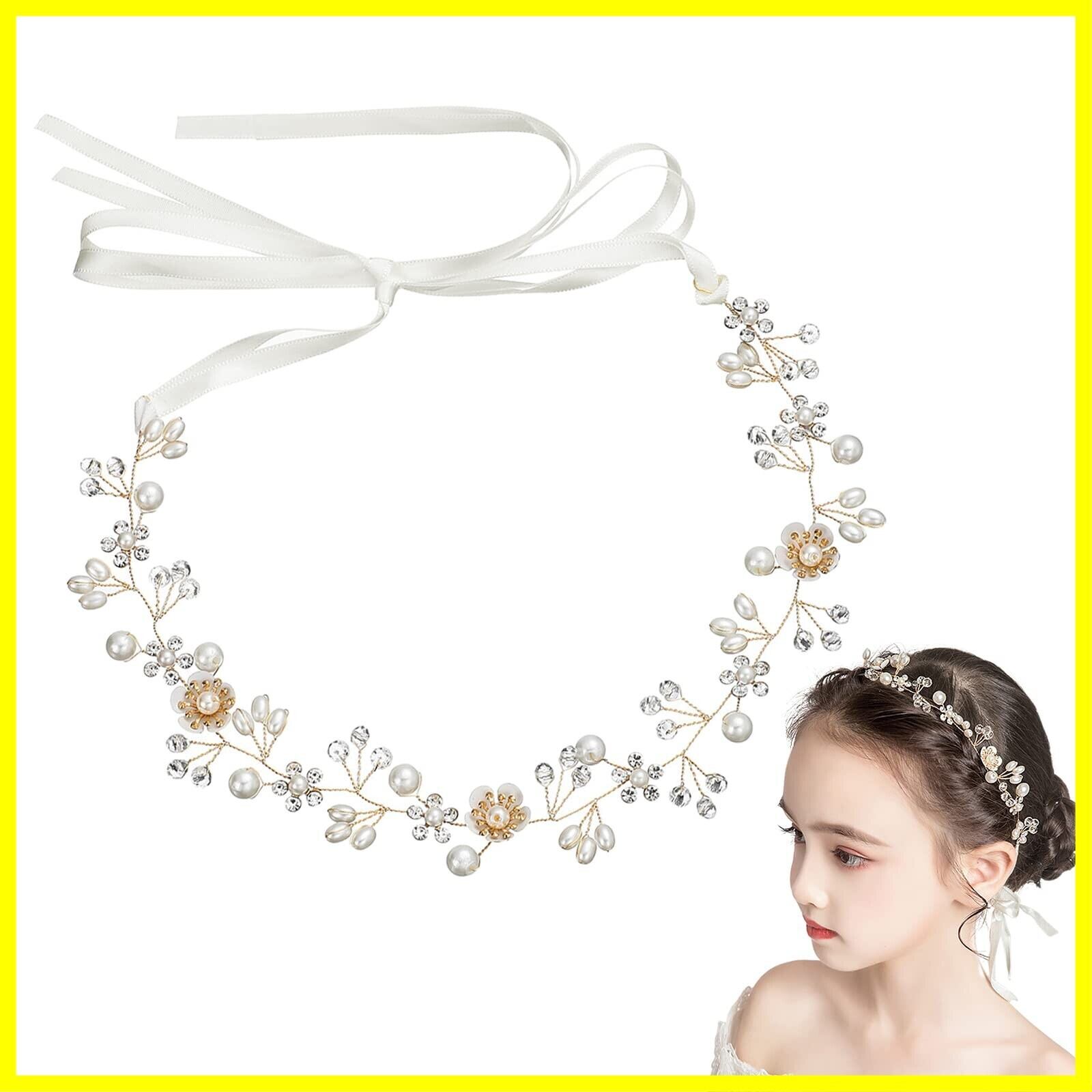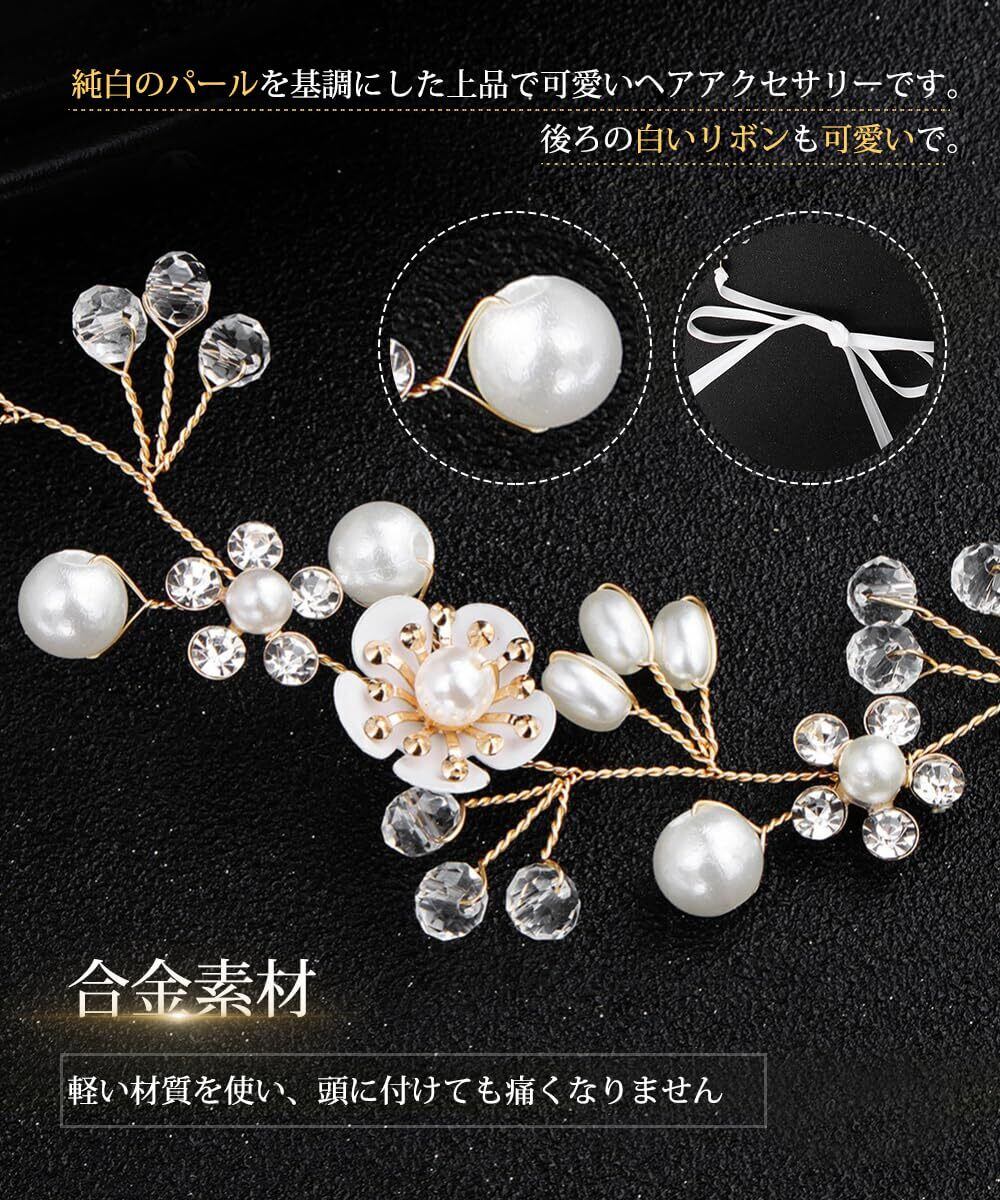 サムコス 髪飾り 花 クリスタルビーズ パール 花かんむり リボン ホワイト ヘッドドレス 花冠 ヘアアクセサリー 結婚式 発表会 披露宴 卒業式 パーティー ダンス 和装 撮影 写真 子供 大人用 (A,ゴールド)