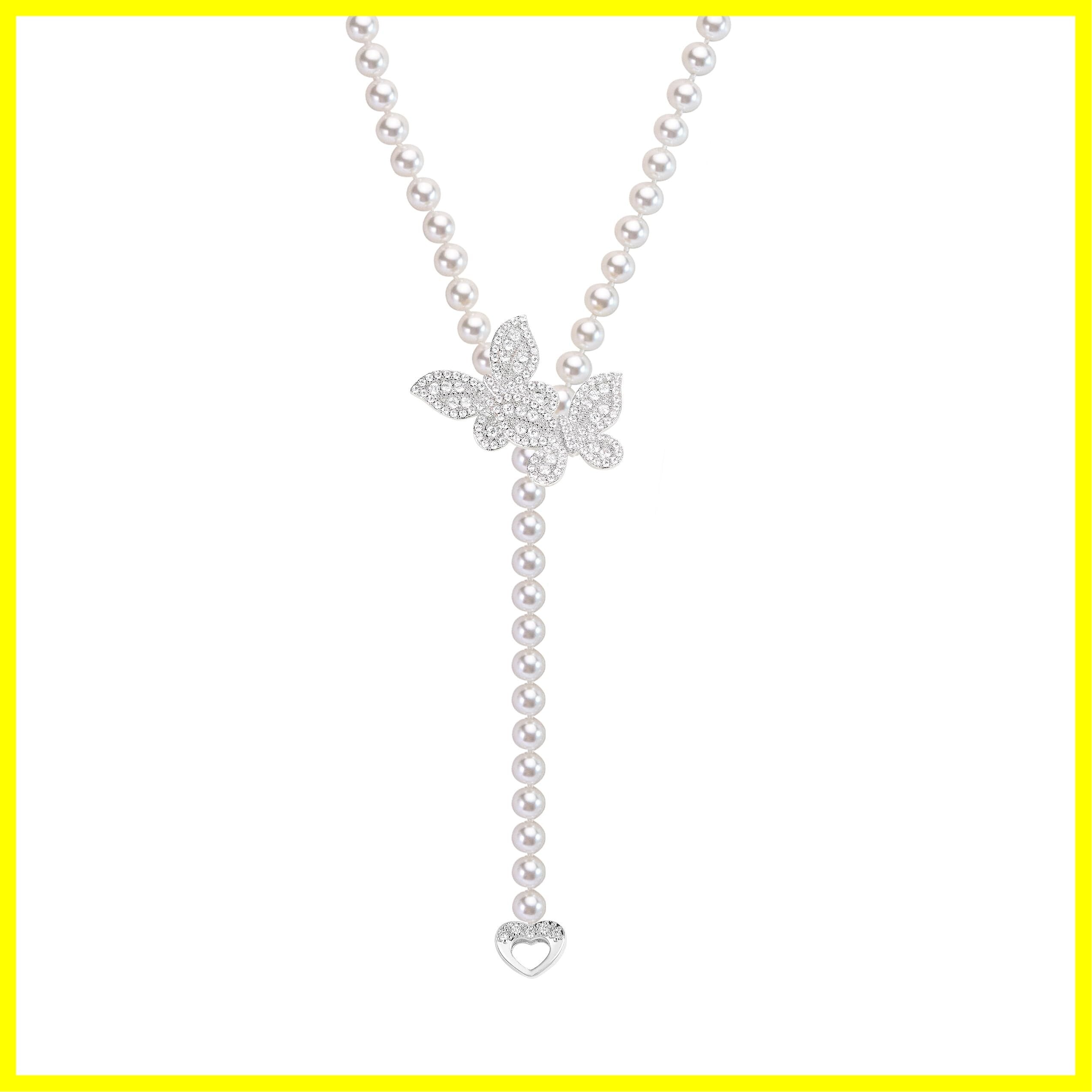 [Free bird] ロングネックレス レディース パールネックレス 貝パール8mm 結婚式 真珠 母 女性 ネックレス90cm調整式 宴会 誕生日 クリスマス 妻 彼女 母の日 プレゼントプレゼント(多様な付け方) (シルバー蝶)