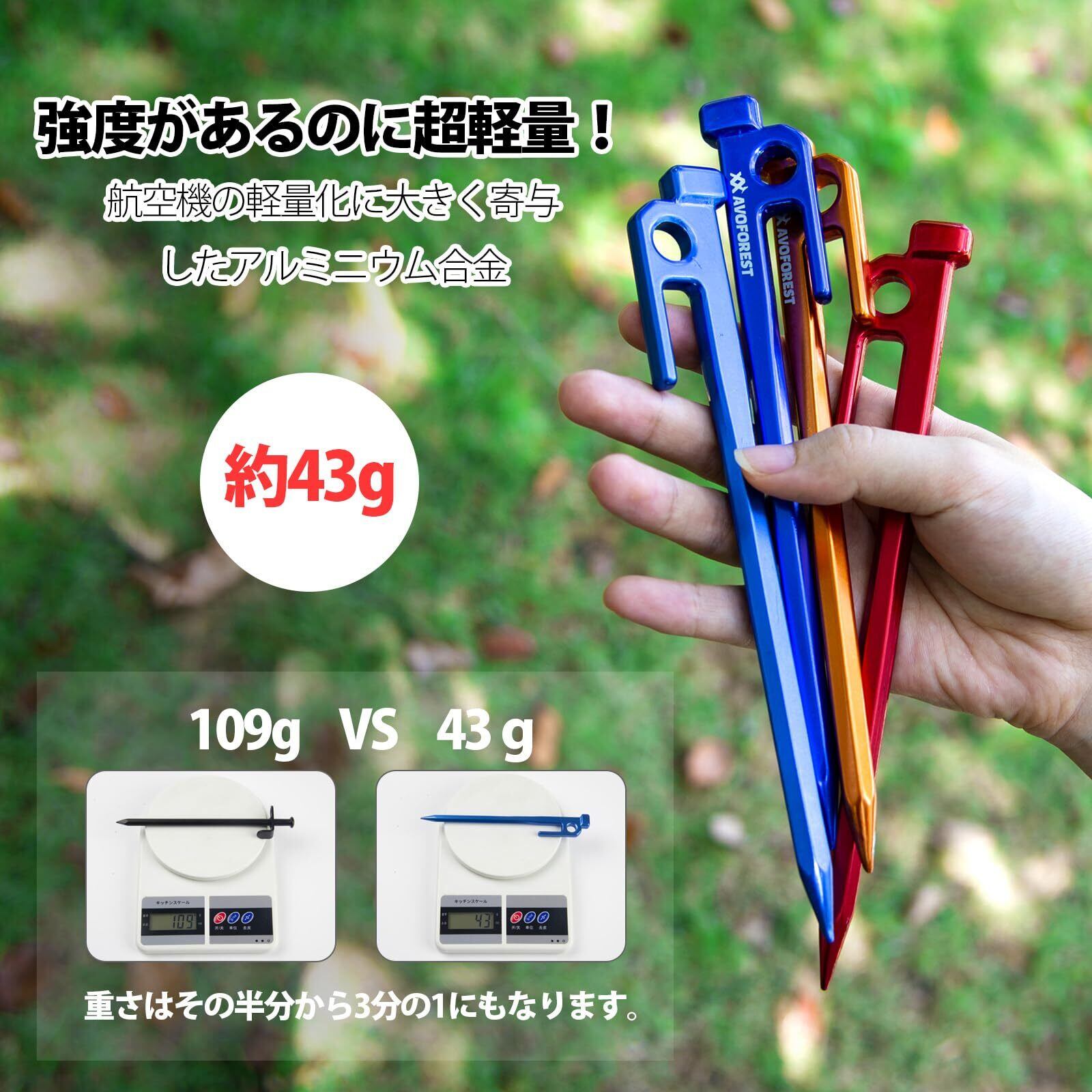スチール製の鍛造ペグの 「重いので携帯が大変 」の悩みを徹底的に解決しました。 軽量なアルミの鍛造で作られたペグで、スチール製の鍛造ペグに比べて62%の軽量化に成功。 20cm1本あたりの重さはわずか46gだ。あまりに重い荷物を持てない女性の方やお年寄りの方にもおすすめです。