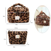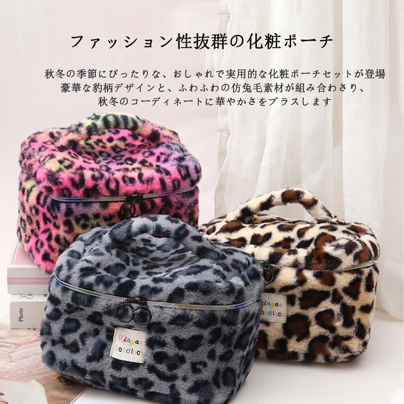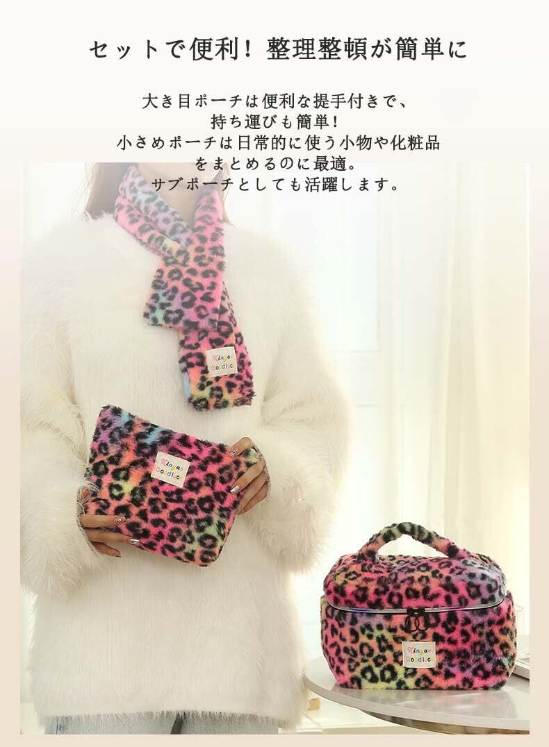 トレンド感溢れるレオパード柄!実用性抜群の2個セット化粧ポーチ 秋冬らしいおしゃれなレオパード柄と、ふわふわのラビットファー風素材が魅力の化粧ポーチセット。大きいサイズと小さいサイズの2個セットで、コスメ収納をもっと便利に、もっとスタイリッシュに!日常使いはもちろん、旅行や出張のお供にもぴったり。化粧好きのあなたに欠かせないアイテムです。