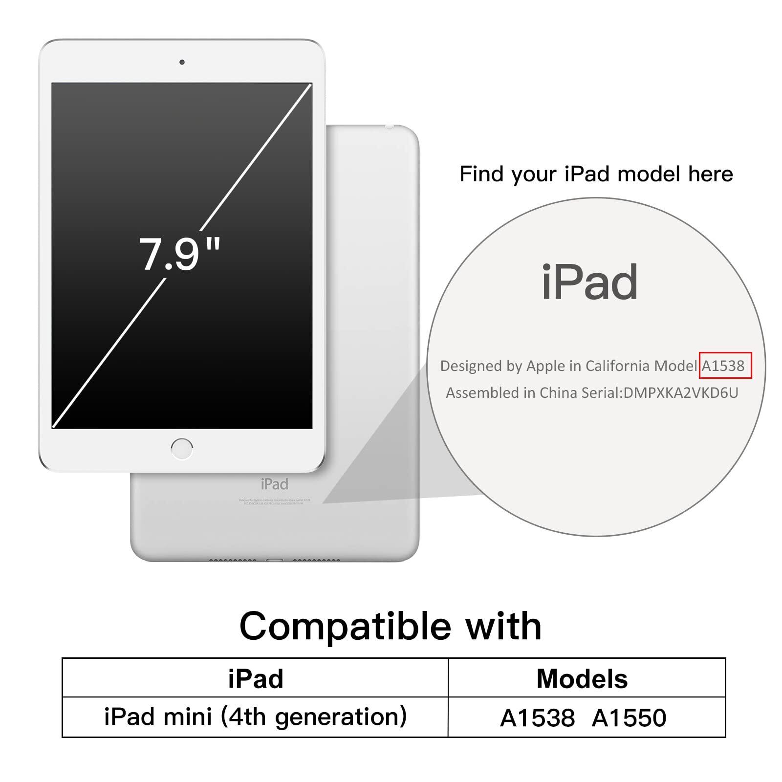 iPad mini 5 2019モデル/mini 1/mini 2/mini 3に対応できない。iPad mini 4のために専門設計。ご購入の前、iPadの機種をご確認お願いいたします。デバイス裏面のモデルをご確認ください。(対応モデル:A1538/A1550)