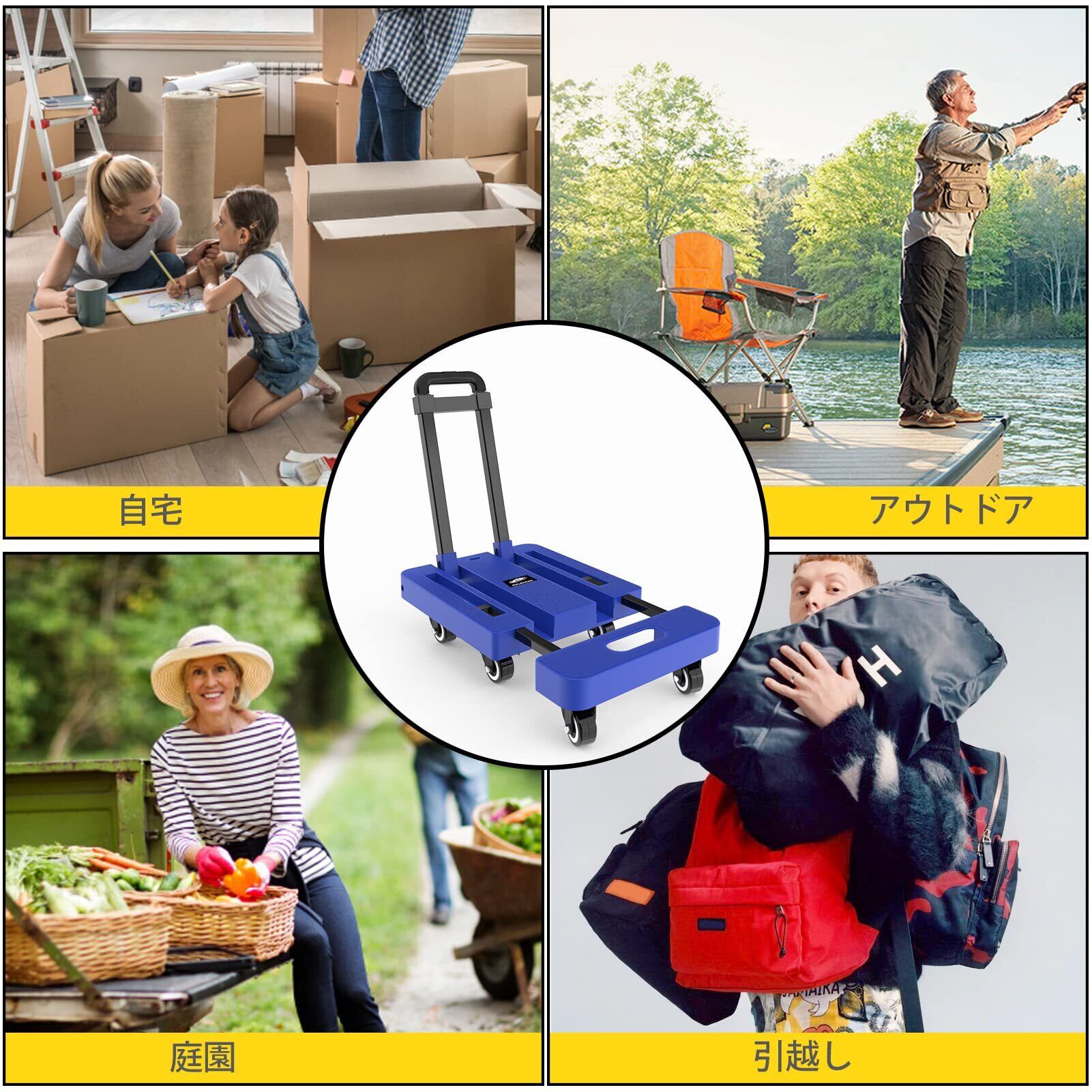 【頑丈な素材】この台車は、特製プラスチック荷台、厚くステンレススチールハンドルと六つのゴム製キャスターがあり、最大耐荷重も266KGぐらいに達しています。安定性のために、荷物を荷台の中央に置いてください。不平な地面で使えば、移動のスピードも注意ください。