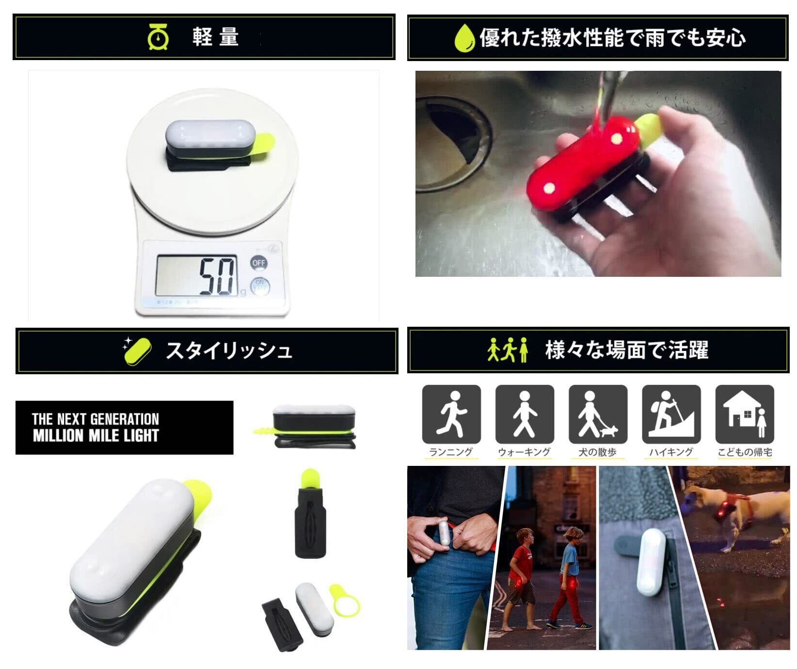 ◆最大30ルーメン・小型で携帯性抜群・優れた撥水性・軽量性を兼ねそろえた性能の高さ!(※ミリオンマイルライトは足元を照らすライトではなく、認知してもらう"安全ライト"です)